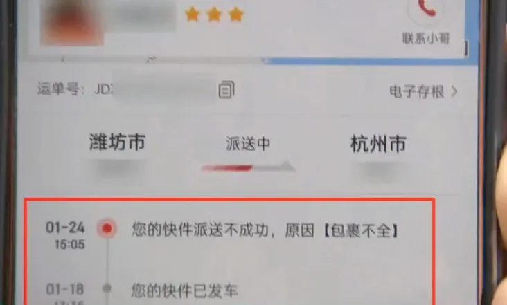 查询了京东快递的物流页面显示:1月16号18:45,快件由潍坊青州古城营业部完成揽收。1月18号早上06:36,快件由杭州散货分拣中心准备发往杭州下城营业部。1月18号13:35,快件已发车。1月24号下午15:05。快件派送不成功,原因是包裹不全。