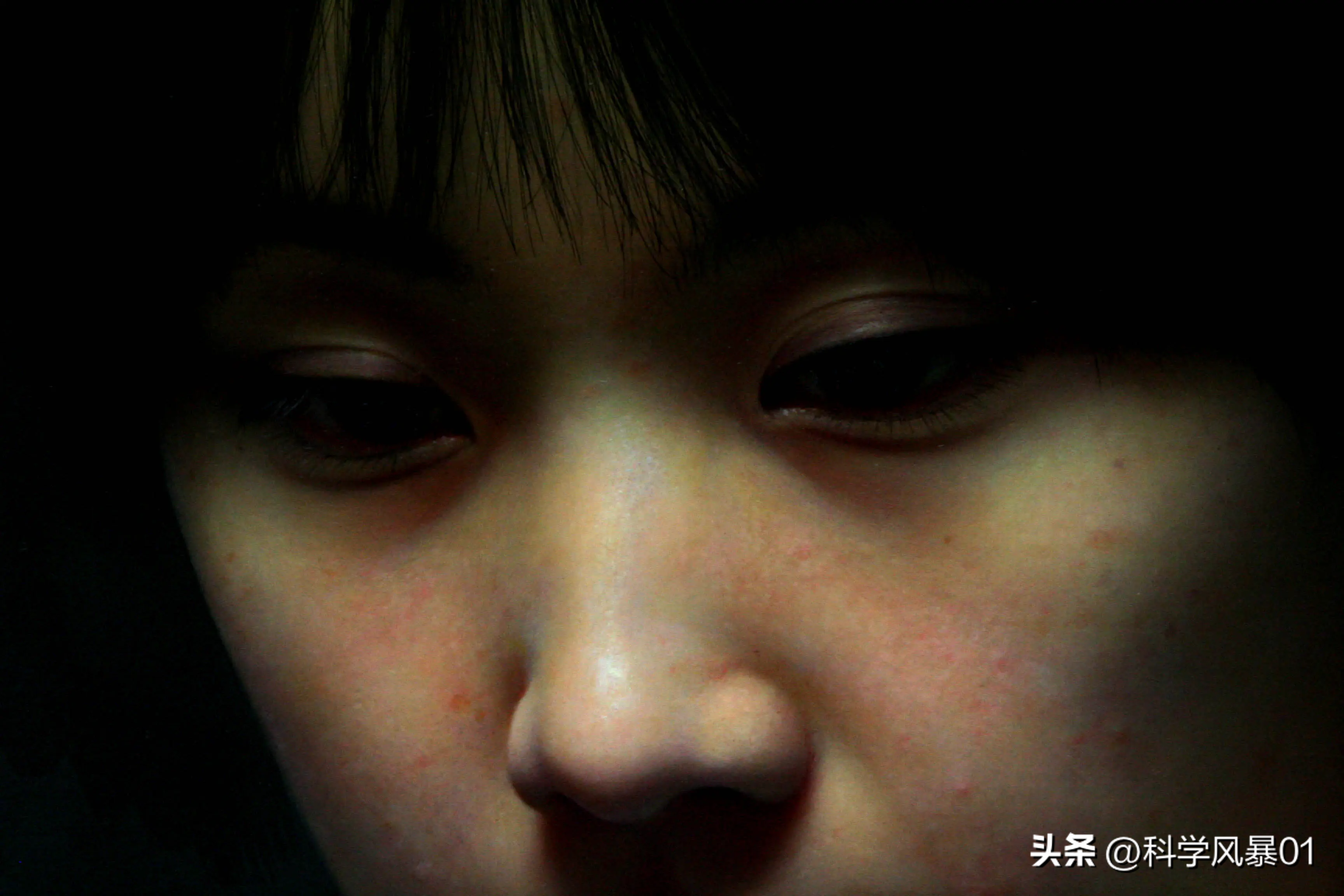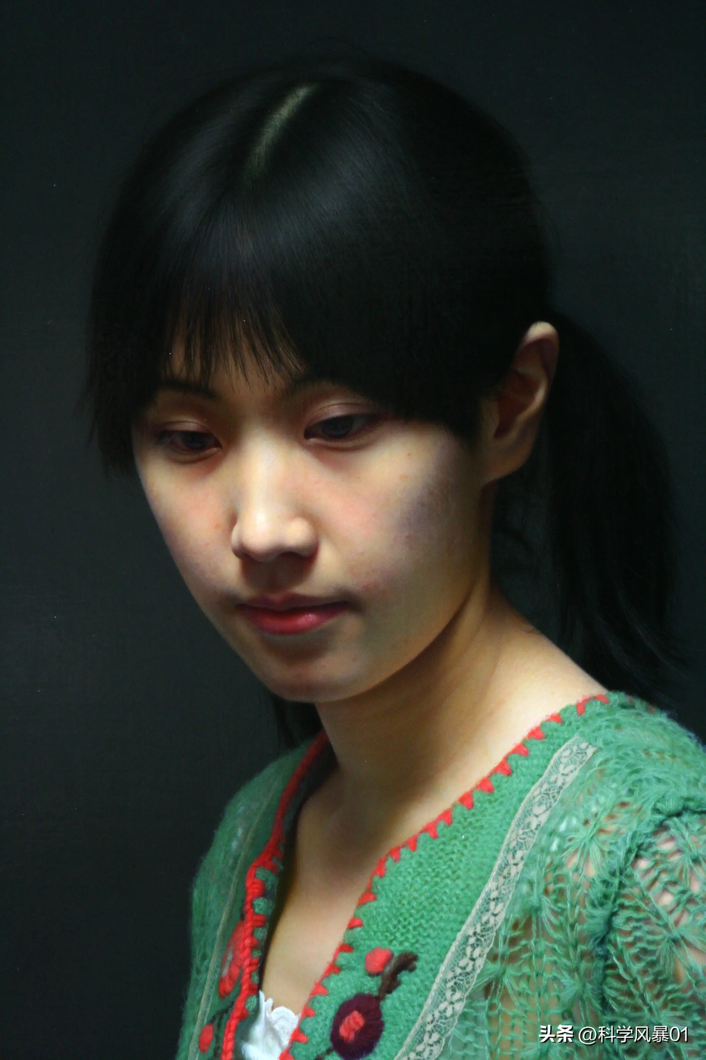 这幅画中小姜穿的毛衣上面有很多细小的绒毛, 在放大十几倍,都会栩栩如生地呈现在我们的眼前中。而小姜脸上细小的斑点和绒毛和真人没什么区别。其实冷军的很多人物作品放大20倍去看,也能能清晰地看到人物身上的每一根毛发,皮肤下的静脉也能表达出来,头发甚至能一根根分出来,甚至衣服上每个小褶皱都显而易见。