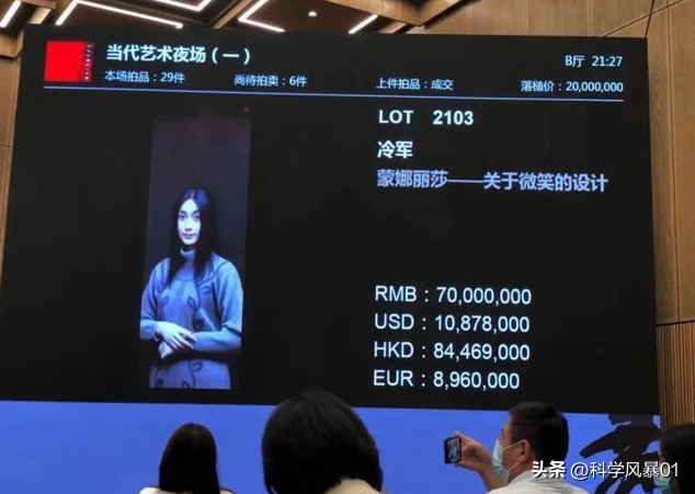 图1是冷军创作的《蒙娜丽莎—关于微笑的设计》,在嘉德2021年春拍“当代艺术夜场”中以8050万元的价格成交。拍卖现场以5800万起拍,在不到一分钟就被加价到7000万,然后就没有人再加价了,结果以7000万成交,加上佣金共8050万,创下了冷军的拍卖新纪录。
