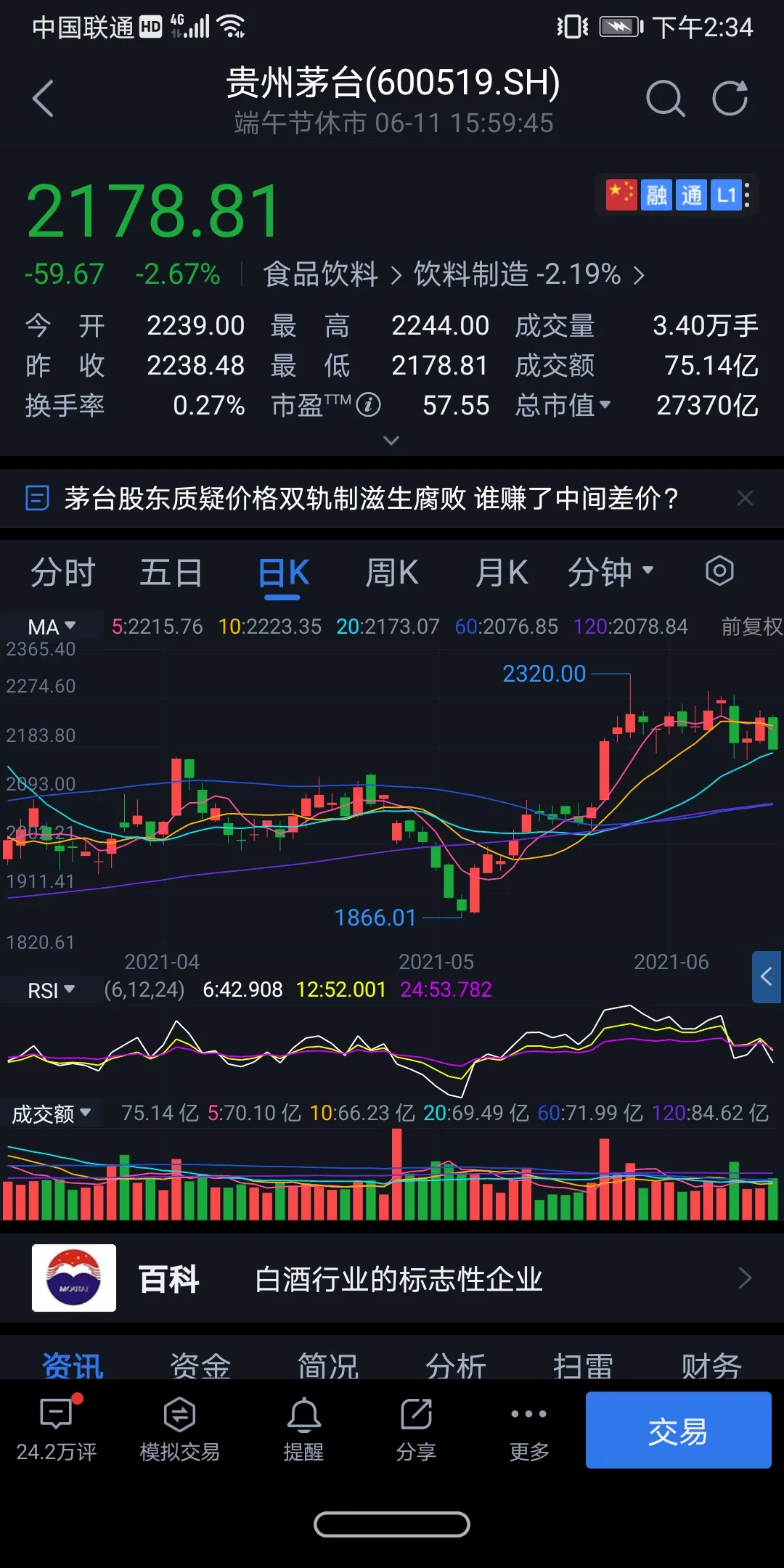 2.这其中,贵州茅台由2219元直线下探至2178元,尤其引人注目。