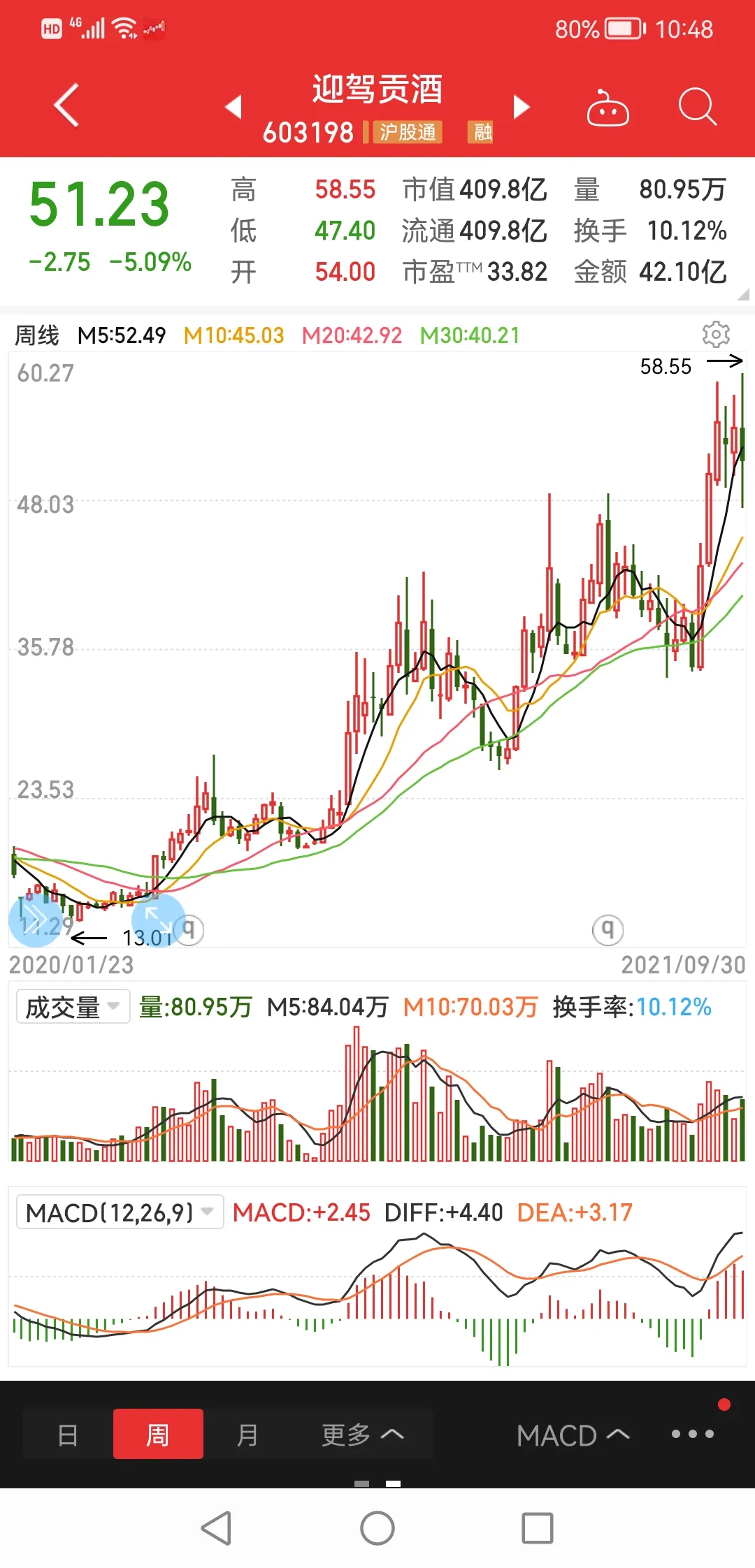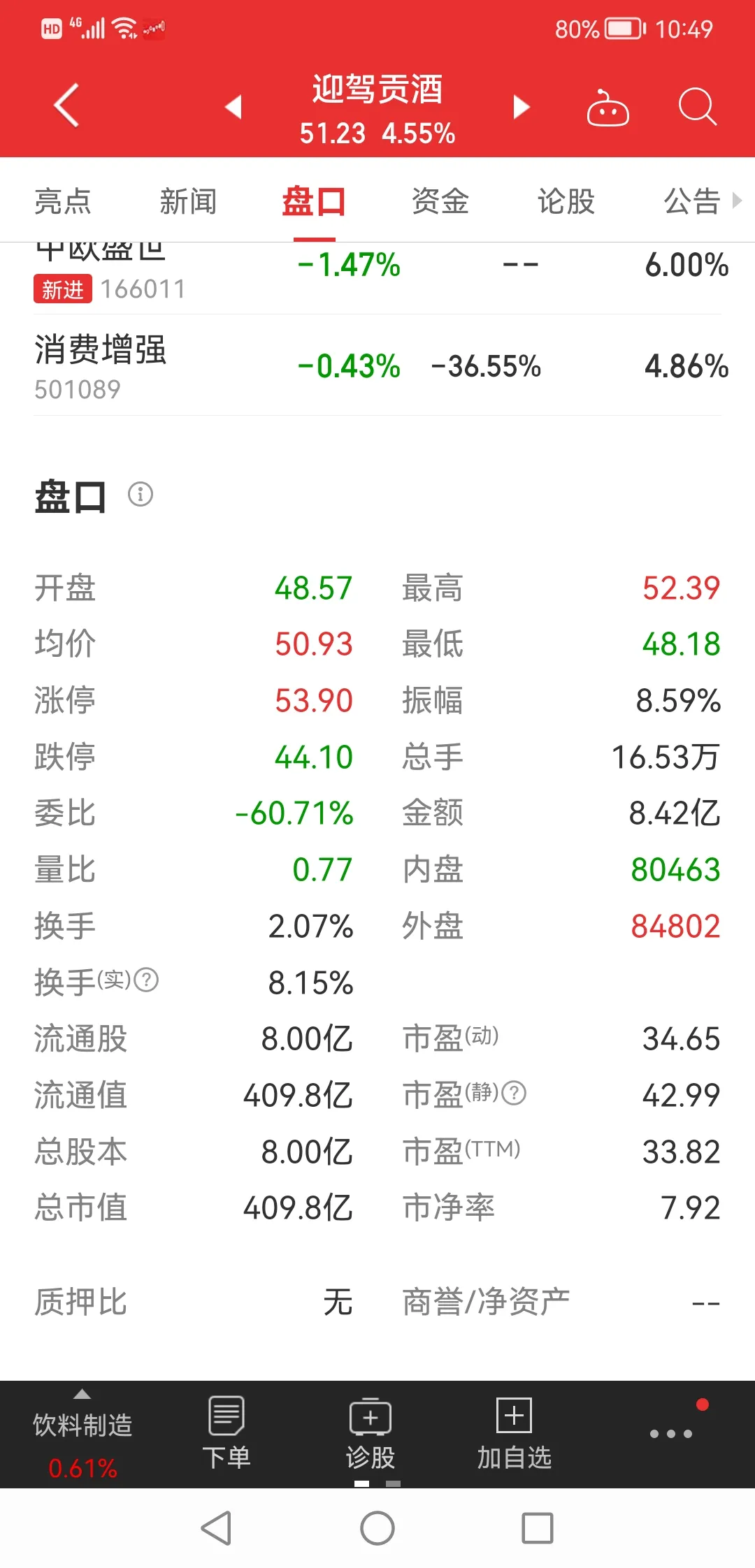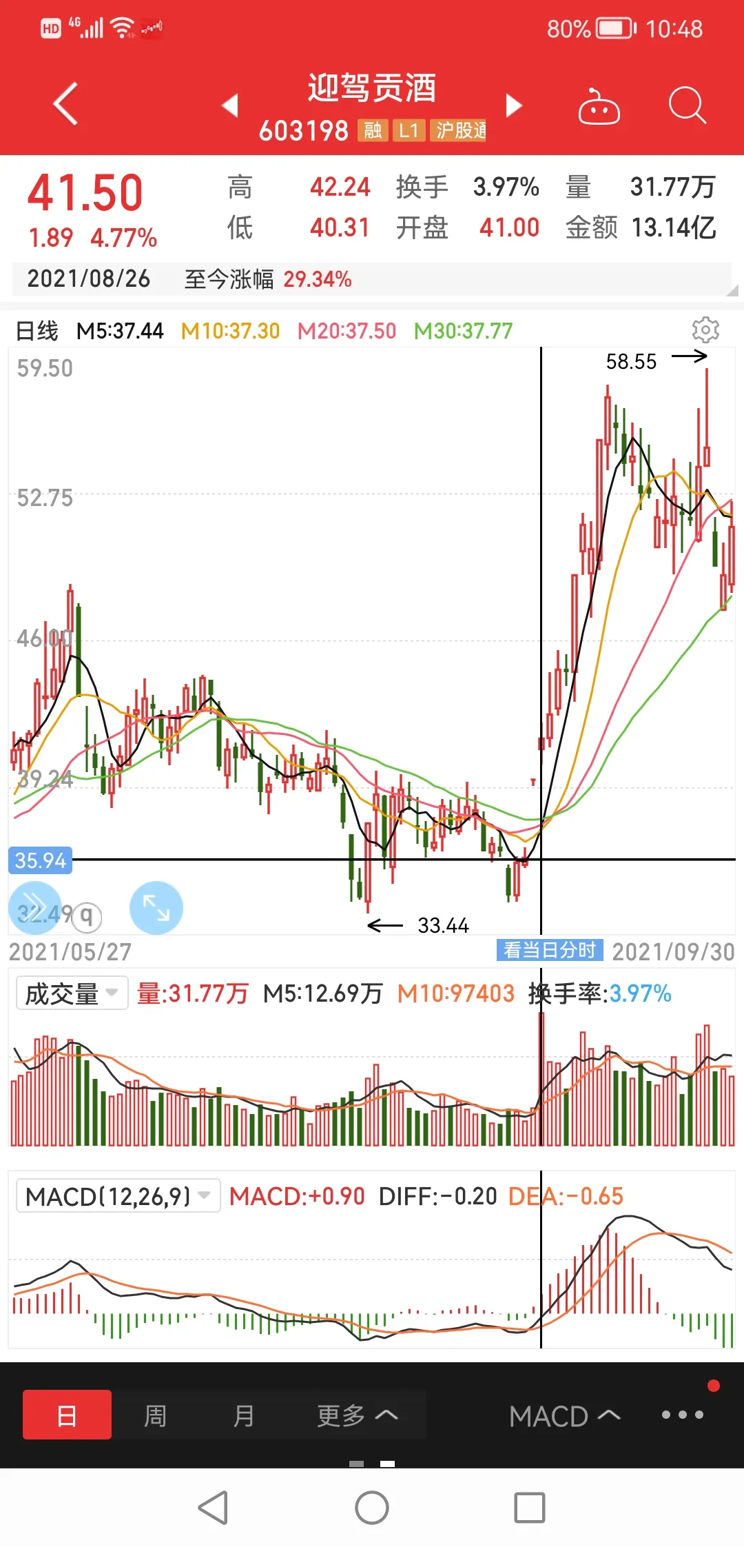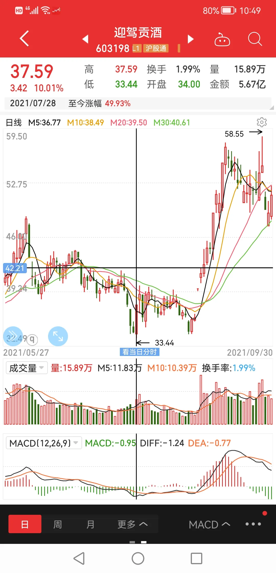 1.迎驾贡酒的短线交易思想公司是安徽知名白酒品牌,盘子小,中报业绩好,是主力喜欢炒作的题材,高端白酒有报团属性,就是涨会一起涨,跌会一起跌,二线白酒主要看业绩,和高端白酒涨跌的关联性会弱一些。