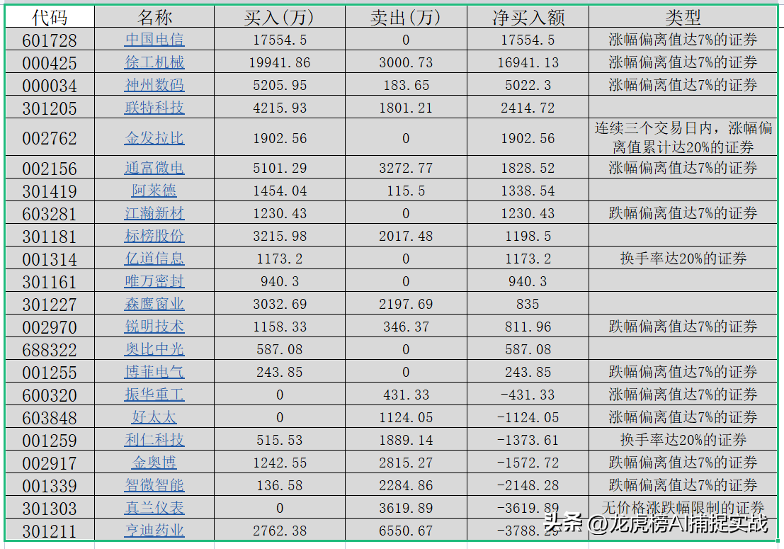 1.2月20日,龙虎榜机构席位净买入排行:代码 名称 净买入额601728 中国电信 17554.5000425 徐工机械 16941.13000034 神州数码 5022.3301205 联特科技 2414.72002762 金发拉比 1902.56002156 通富微电 1828.52301419 阿莱德 1338.54603281 江瀚新材 1230.43301181 标榜股份 1198.5001314 亿道信息 1173.2301161 唯万密封 940.3301227 森鹰窗业 835002970 锐明技术 811.96688322 奥比中光 587.08001255 博菲电气 243.85600320 振华重工 -431.33603848 好太太 -1124.05001259 利仁科技 -1373.61002917 金奥博 -1572.72001339 智微智能 -2148.28301303 真兰仪表 -3619.89301211 亨迪药业 -3788.29排名前三的分别是:1、601728 中国电信 (不赘述)2、000425 徐工机械 主题概念:集筑路机械、铲运机械、路面机械等工程机械的开发、制造与销售,产品达四大类、七个系列、近100个品种,主要应用于高速公路、机场港口、铁路桥梁、水电能源设施等基础设施的建设。