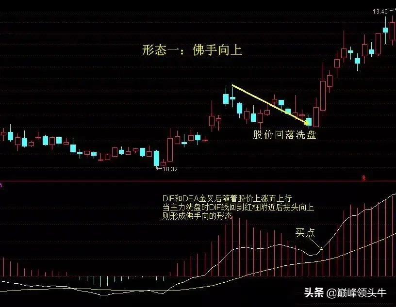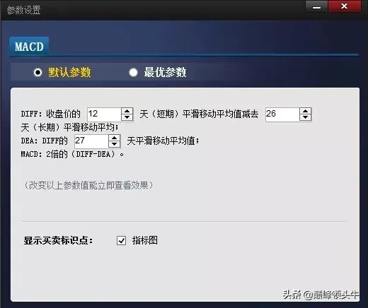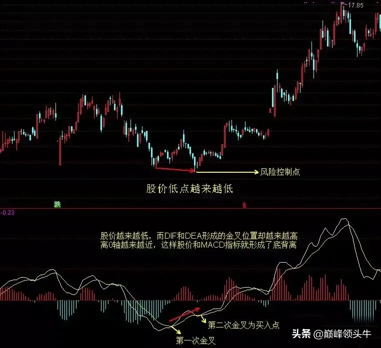 4.白线DIF:也就是我们常说的快线黄线DEF:称之为慢线MACD底背离操作步骤:1:默认参数为(12.26.9)修改(12.26.27)2、(图2)当股价出现近期新低,但是MACD的白线上穿黄线形成金叉,股价不再向下突破,并且趋势线越来越靠近0轴,这时如果出现第二次金叉就可介入!3、(图3)两根趋势线伴随着股价同时向上,当出现主力洗盘时,白线回落到红柱或黄线附近,黄线趋势并没有发生改变,等到白线拐头向上,为上车点。