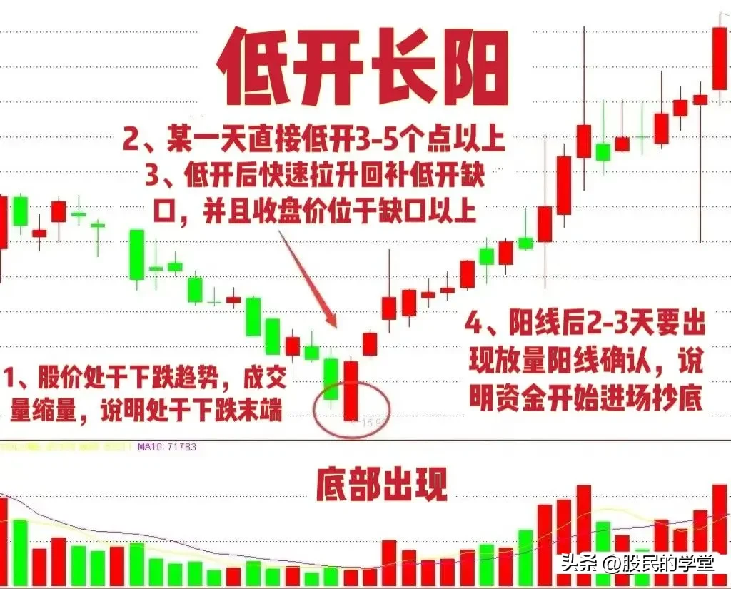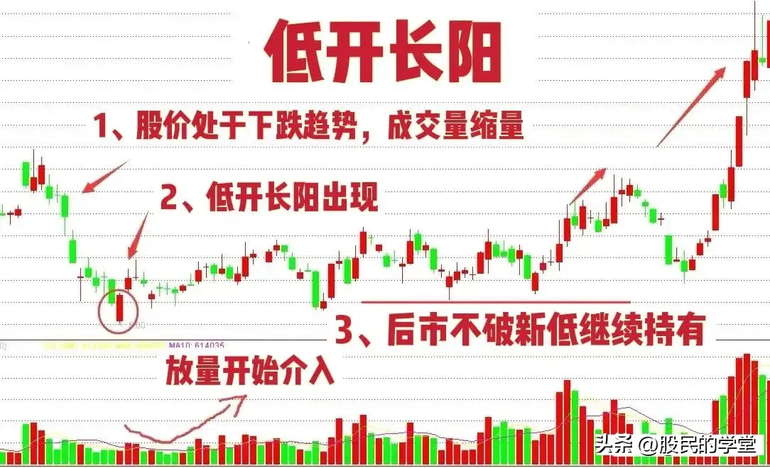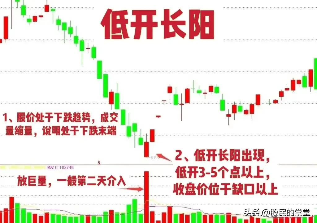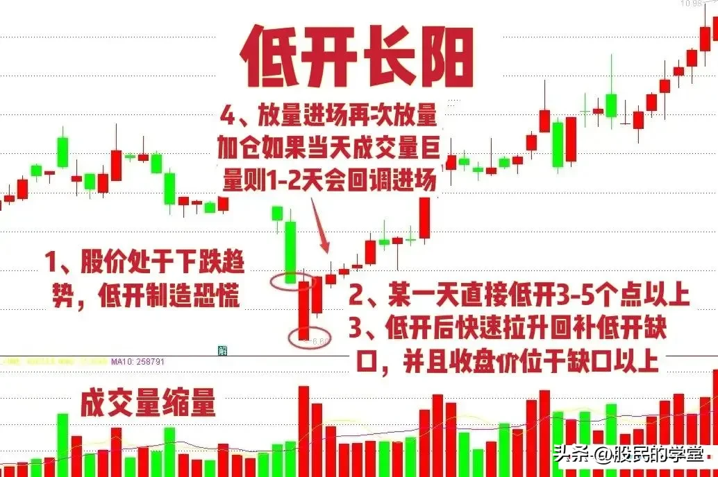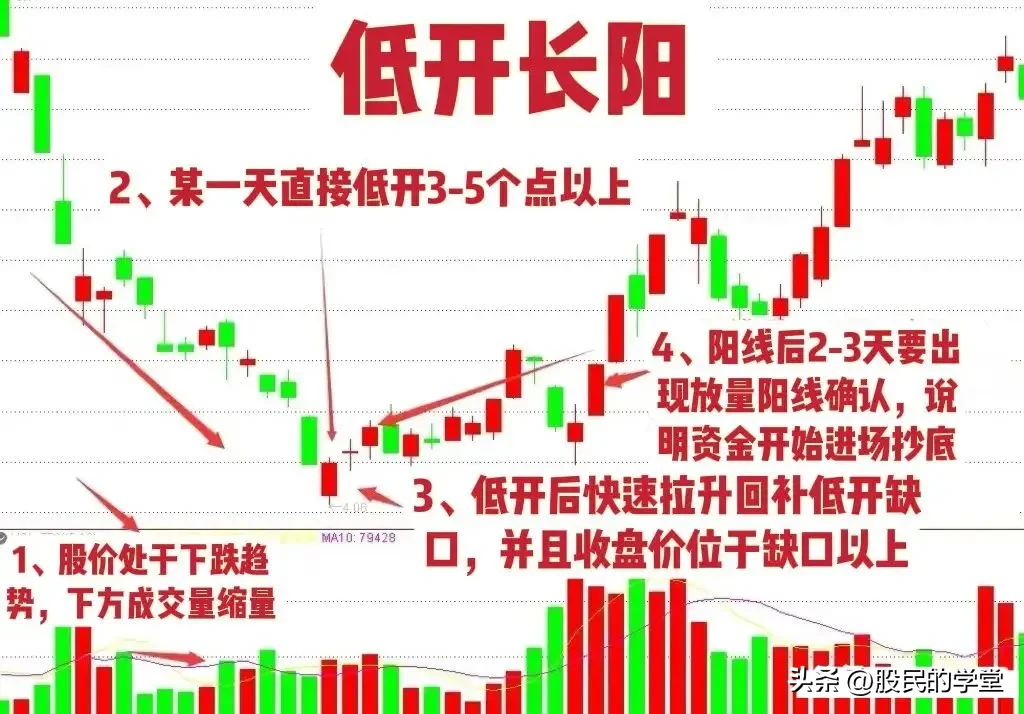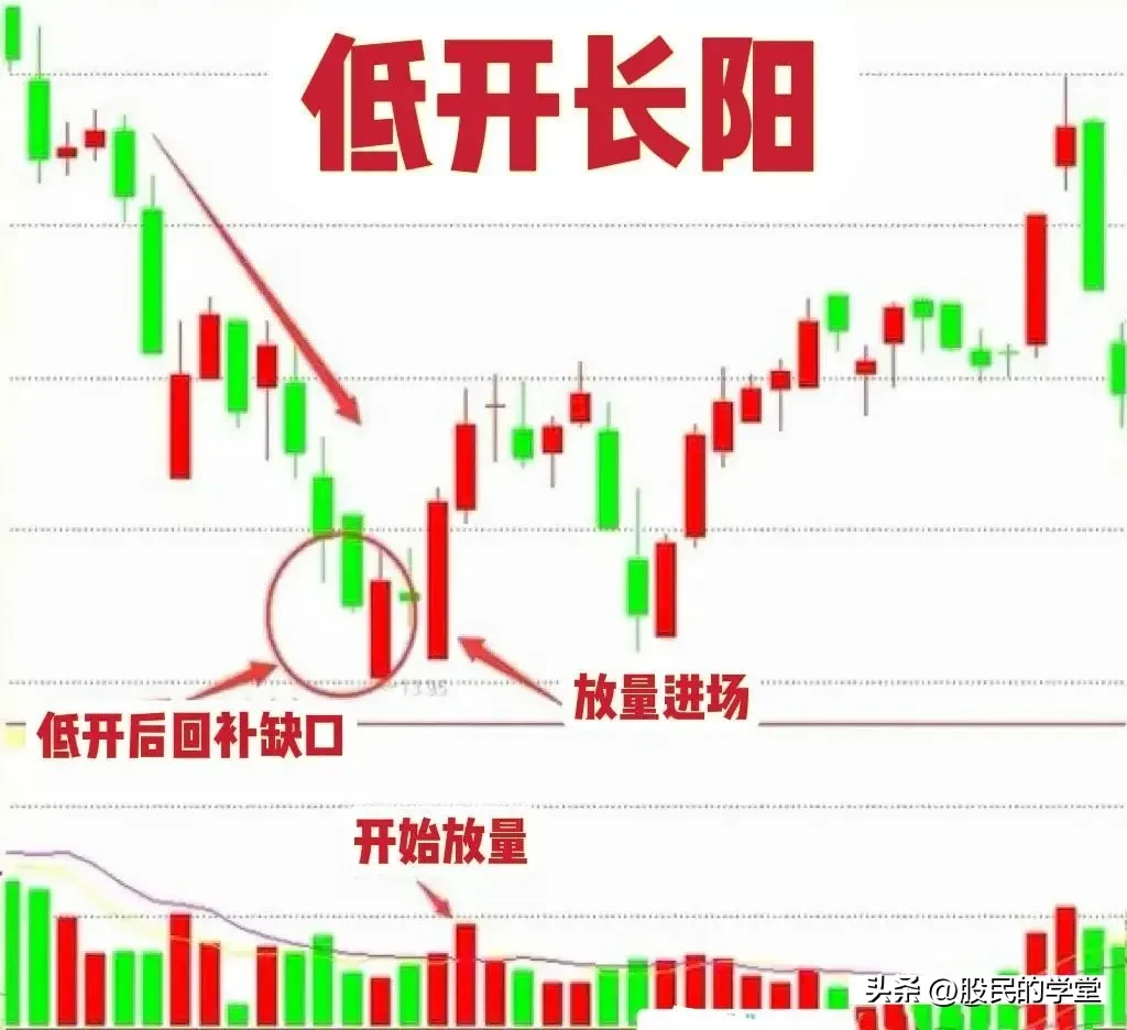 1.炒股,下跌一段行情后,在低位出现低开高走的长阳拉升,就是“低开长阳”短线形态战法,建议收藏转发!这个形态往往出现在下跌末端,某天股价低开,是主力为了制造恐慌让散户交出筹码,顺势将筹码收集好,低开之后便迅速回补缺口,而且收盘的时候也是收在了缺口上方,形态一旦确立,当成交量放量的时候可以大胆进场。