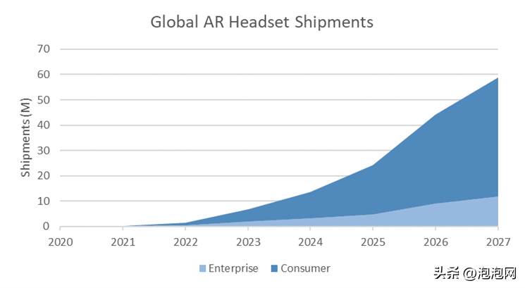 2.在大热的元宇宙概念的带动下,AR行业也迎来了快速发展,根据Strategy Analytics数据,消费级AR终端市场规模在2020-2021间增长了2倍,而到2027年,预计全球AR设备的出货量将会接近6000万,具备相当迅速的增长势头。