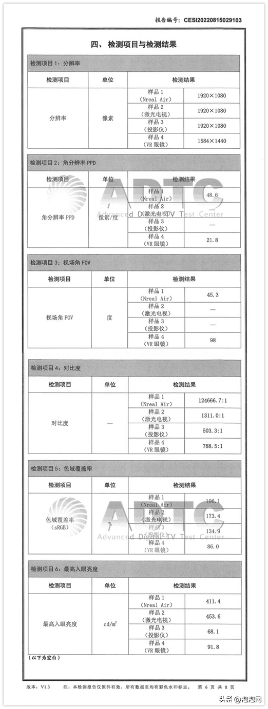 4.作为一款显示设备,Nreal AR眼镜的显示效果如何呢?近日,中国电子技术标准化研究院赛西实验室就针对激光电视、投影仪、VR眼镜和Nreal AR眼镜进行了对比检测,我们可以更直观地看到不同设备的指标差异。