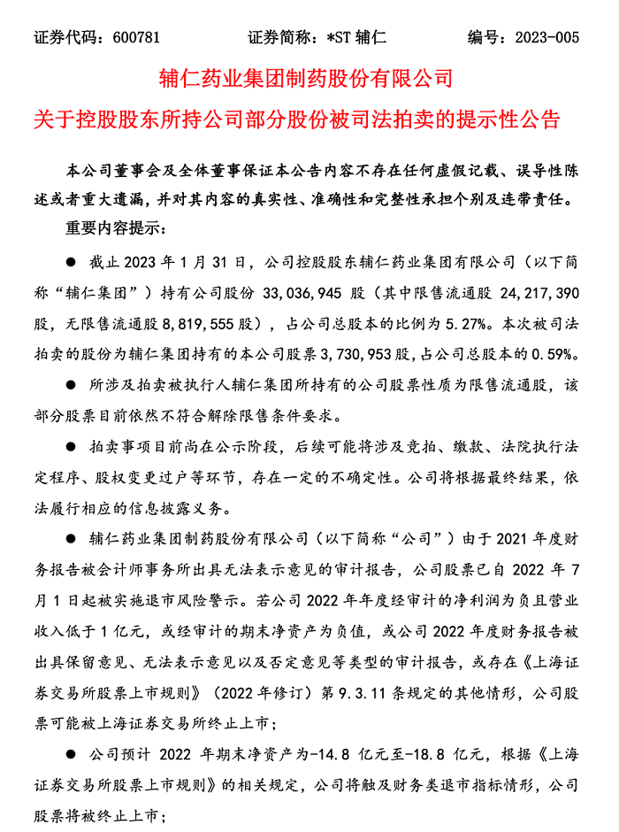 2023年2月9日,600781*ST辅仁发布《关于控股股东所持公司部分股份被司法拍卖的提示性公告》显示,截止2023年1月31日,公司控股股东辅仁药业集团有限公司(以下简称“辅仁集团”)持有公司股份33,036,945股(其中限售流通股24,217,390股,无限售流通股8,819,555股),占公司总股本的比例为5.27%。本次被司法拍卖的股份为辅仁集团持有的本公司股票3,730,953股,占公司总股本的0.59%。