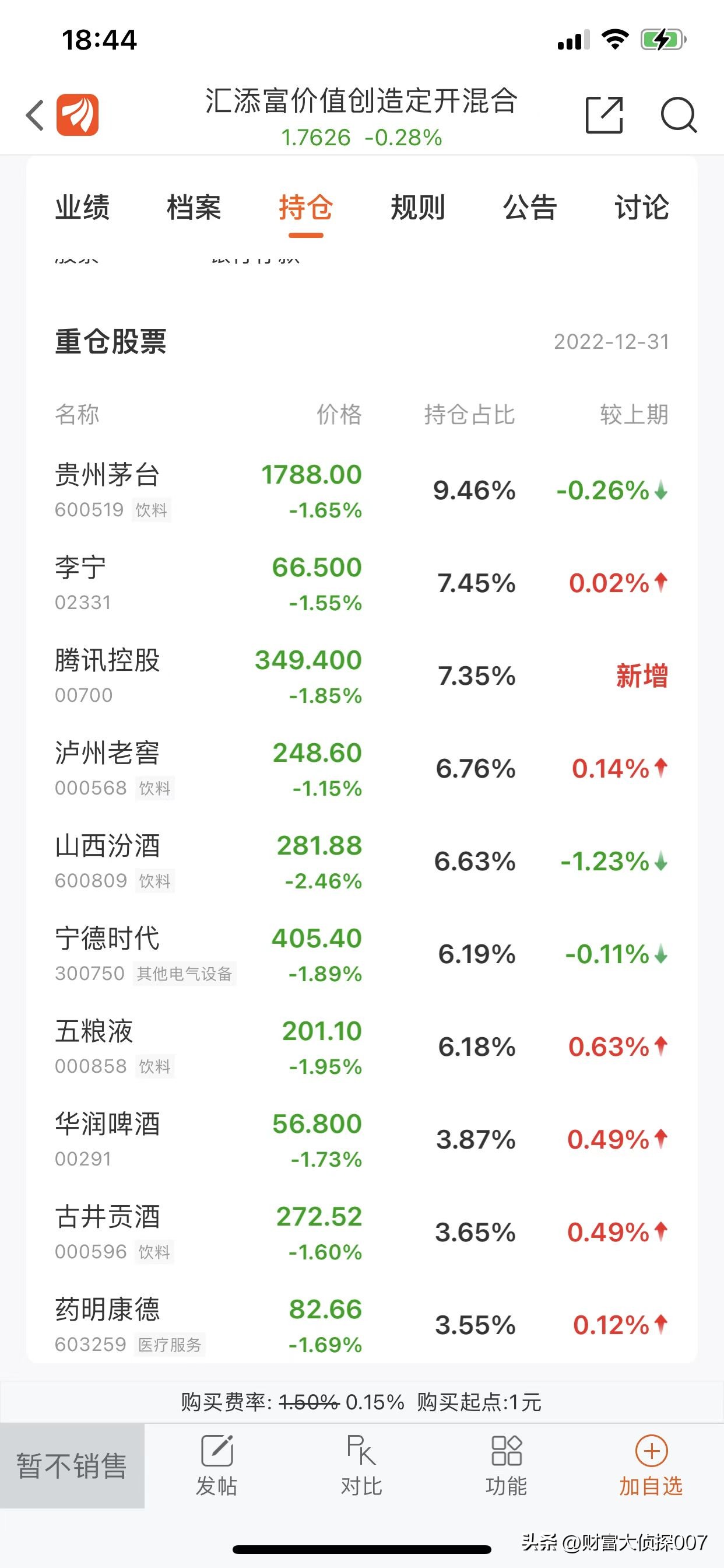 我们来看看2022年四季度末这个基金的持仓情况,主要持有的股票有:贵州茅台、李宁、腾讯控股、泸州老窖、山西汾酒、宁德时代、五粮液和华润啤酒。