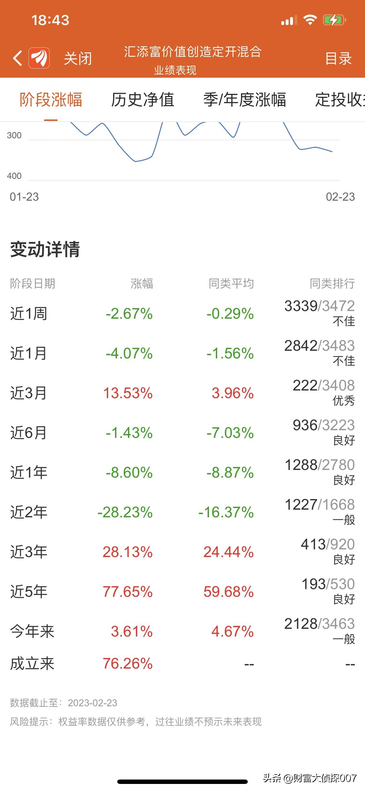 今天分享的这只产品是2018年1月成立的,成立时间超过5年,成立以来赚了76.26%,应该是比较一般的业绩,估计主要原因是这两年消费价值板块暴跌回调,所以业绩受到影响吧。
