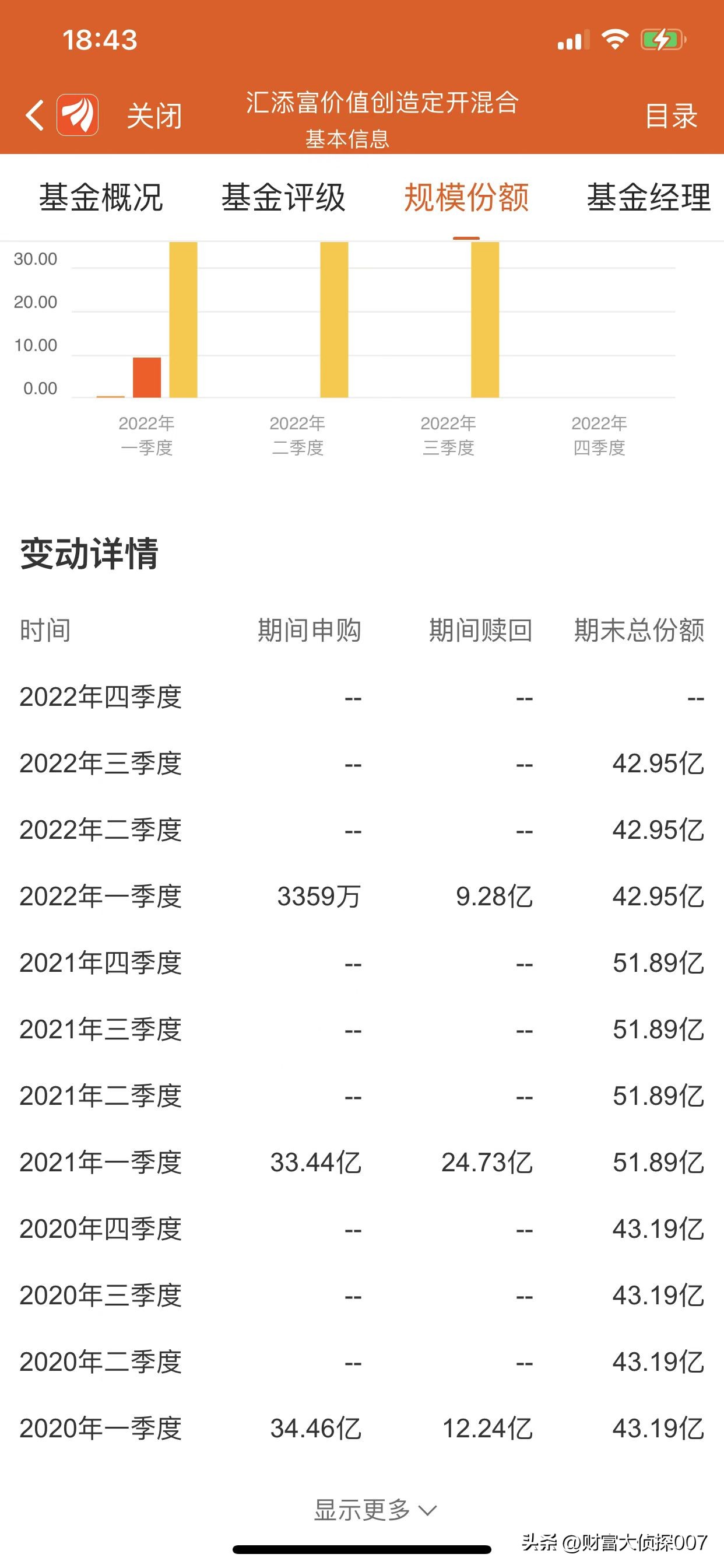 来看看这只基金的规模变化情况。因为这只基金是一只定开基金,所以不是每个交易日都能申赎,从份额变动来看,应该是每年一季度打开申赎。从份额来看的话,这只基金这几年先是增加然后又减少了一些。2020年一季度末,是43.19亿份;2021年一季度末时,是51.89亿份;2022年一季度末时,是42.95亿份。
