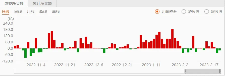 正常情况下两融余额曲线与大盘走势基本上是同步的,粘合在一起。年前就走出了背离,好在年后两融一直在买入,最近的差距越来越小了。北向最近虽然在小幅卖出,但是跟之前的买入压根不是一个级别,买的时候连续创纪录,一言不合就一两百亿,流出就是偶尔小几十亿或者几亿。所以现在的状况是内外慢慢磨合,可能过不了多久就会趋向一致,到时候的行情可以想象。