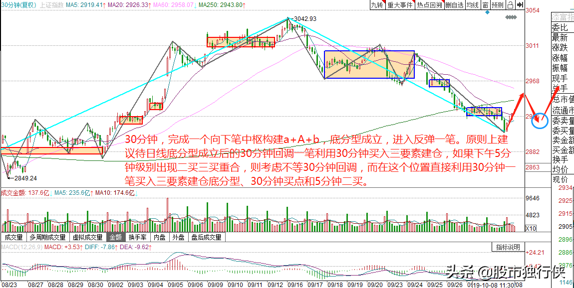 9.原则上建议待日线底分型成立后的30分钟回调一笔利用30分钟买入三要素建仓,如果下午5分钟级别出现二买三买重合,则考虑不等30分钟回调,而在这个位置直接利用30分钟一笔买入三要素建仓底分型、30分钟买点和5分钟二买。