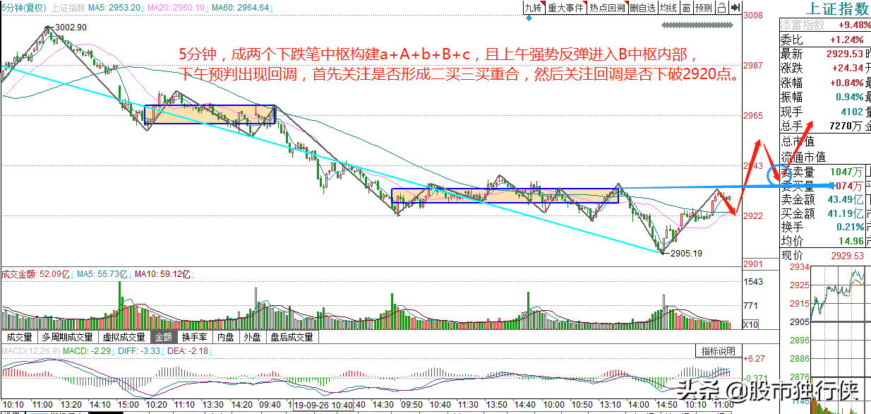 10.3、5分钟,成两个下跌笔中枢构建a+A+b+B+c,且上午强势反弹进入B中枢内部,下午预判出现回调,首先关注是否形成二买三买重合,然后关注回调是否下破2920点。