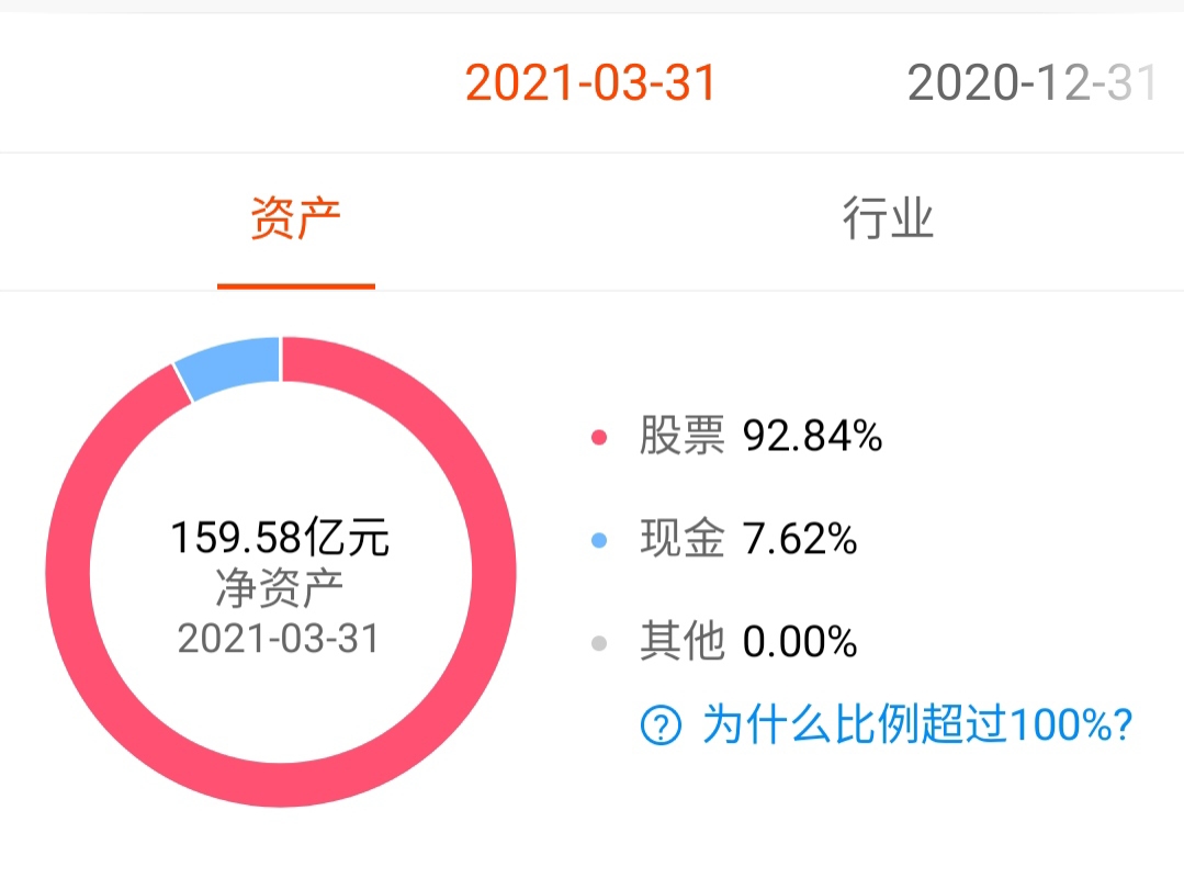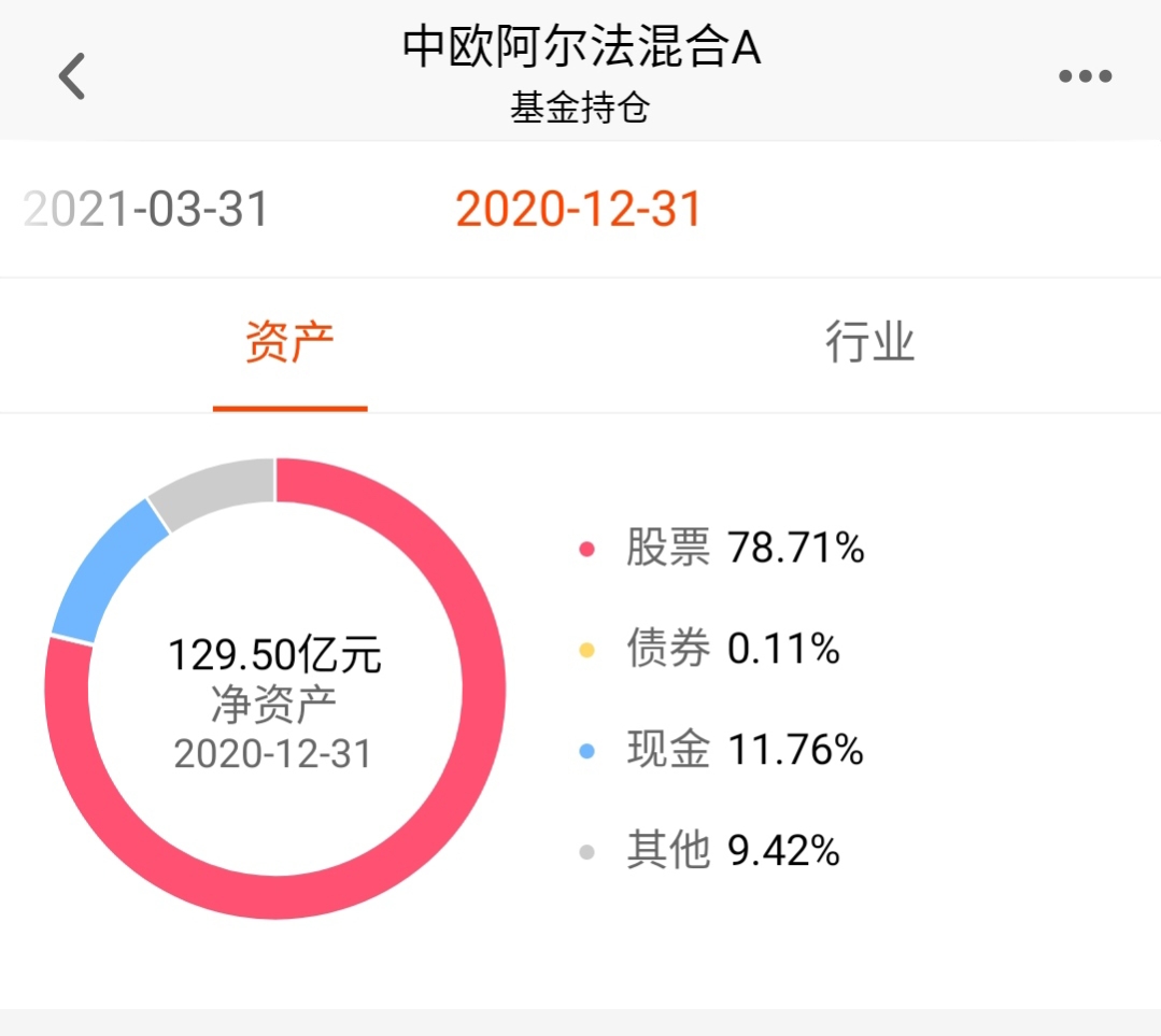 18.我查看了中欧阿尔法的持仓报表,截至2020年12月31号的时候基金资产里面是78%的股票,这个比例还是比较低的,因此可能截至去年12月底,中欧阿尔法的建仓都不算完全彻底结束。