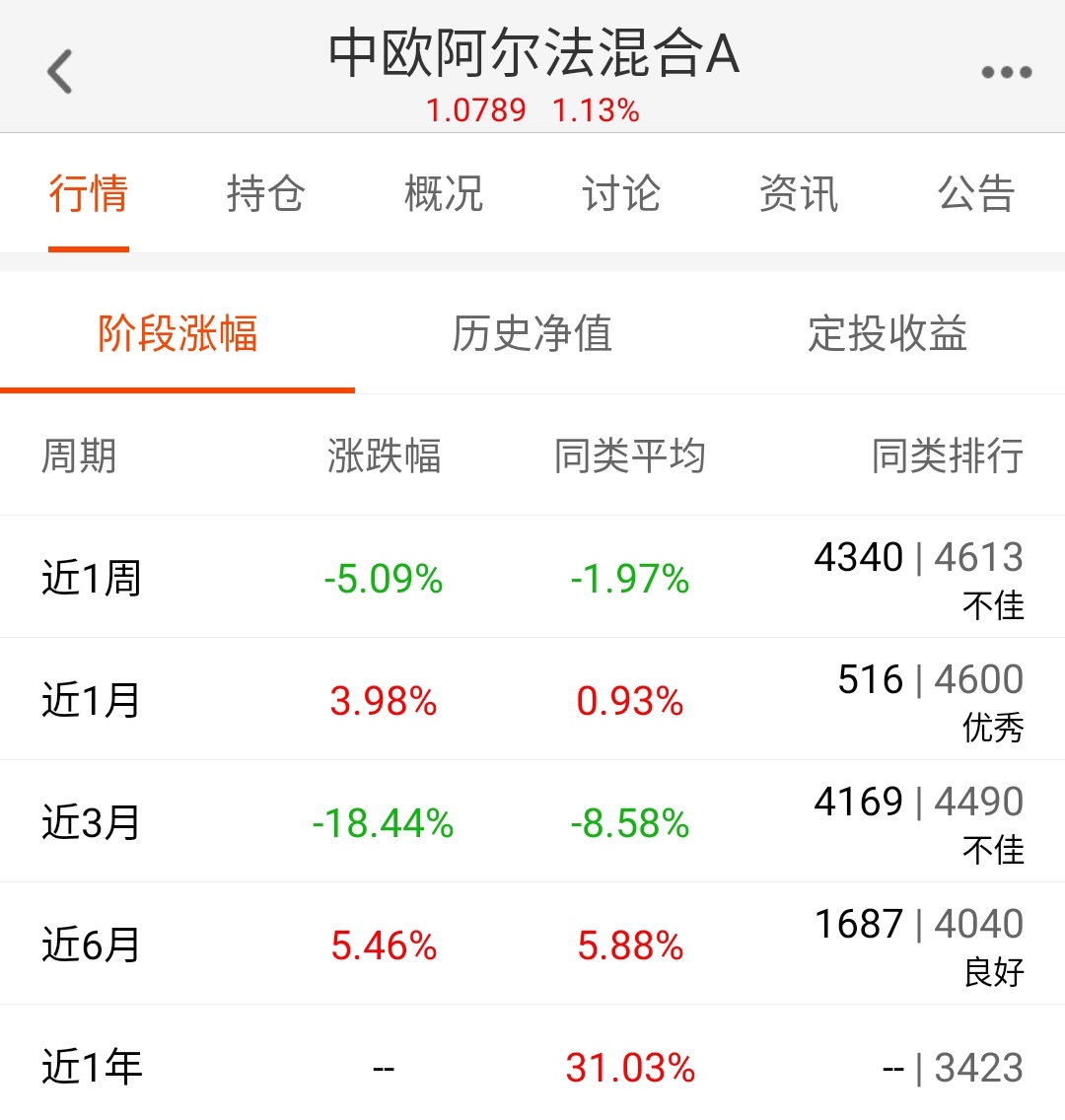 14.如果是从近6个月来看中欧阿尔法的收益,似乎比其他混合型基金要差。