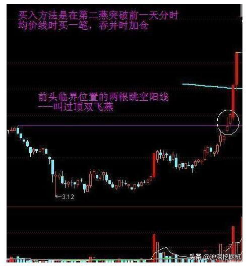 (1)是指一浪顶的临界突破位置,先有一阳中、大阳线,然后两根小阳线。两根跳空阳线,只有一根阳线的,叫单飞燕
