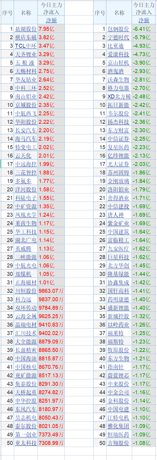 1.周二上午力资金流入流出最新动向:主力净流入前20个股:1 盐湖股份 7.95亿2 横店东磁 3.82亿3 TCL中环 3.47亿4 天齐锂业 3.29亿5 五 粮 液 3.29亿6 天赐材料 2.75亿7 华友钴业 2.64亿8 中科三环 2.52亿9 南山铝业 2.42亿10 京城股份 2.35亿11 中航西飞 2.25亿12 华阳股份 2.22亿13 长安汽车 2.20亿14 海马汽车 2.19亿15 特变电工 2.02亿16 云天化 2.01亿17 中远海控 1.99亿18 三花智控 1.88亿19 多氟多 1.77亿20 洋河股份 1.58亿主力净流出前20个股:1 包钢股份 -6.41亿2 宁德时代 -5.79亿3 比亚迪 -4.93亿4 爱康科技 -4.73亿5 京山轻机 -3.90亿6 酒鬼酒 -2.93亿7 沃森生物 -2.81亿8 格力电器 -2.70亿9 XD北方稀 -2.48亿10 拓日新能 -2.42亿11 韦尔股份 -2.41亿12 扬杰科技 -2.36亿13 东方财富 -2.30亿14 中信证券 -2.25亿15 复星医药 -2.23亿16 亿纬锂能 -2.13亿17 光大证券 -2.03亿18 苏州固锝 -1.86亿19 金刚玻璃 -1.84亿20 洛阳钼业 -1.79亿A股午评:今天的十字星是属于正常走势,不过唯一遗憾的是下方缺口没补,主力资金不敢大幅进场,既然上午不补的话,下午应该也不会补了,继续位置窄幅震荡走势!以上所有数据仅供参考,不作为任何依据! 您的点赞、收藏、转发是对我最大的支持,感谢!#今日复盘# #A股# #股票#有什么想讨论的问题可以在评论区留言~