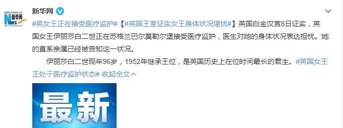 1.超长“待机”的96岁英国女王目前处于医疗监护状态英国白金汉宫今天证实,英国女王伊丽莎白二世正在苏格兰巴尔莫勒尔堡接受医疗监护,医生对她的身体状况表达担忧。