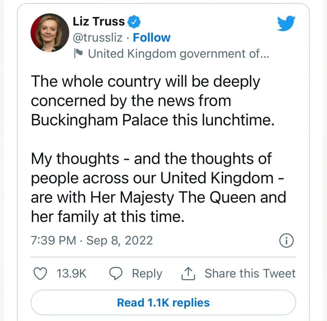 14.英国新首相特拉斯今天也在推特发文称,整个国家都“深切关注”白金汉宫的消息,“此时此刻,我和全英国人民都与女王陛下和她的家人同在”。