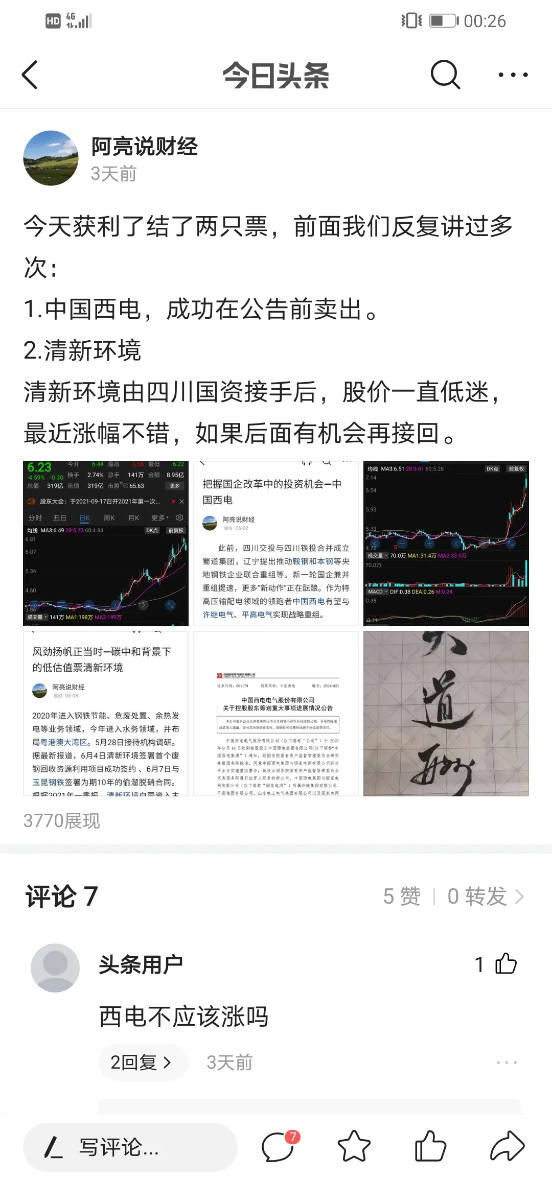3.9.14晚上发微头条,有铁兄弟私信说感觉我们的票都挺好的呀,没有任何下跌的迹象,西电还公告重组大利好哇,清新环境也没有滞涨迹象呀,为什么就卖出了,感觉很突然,不理解。