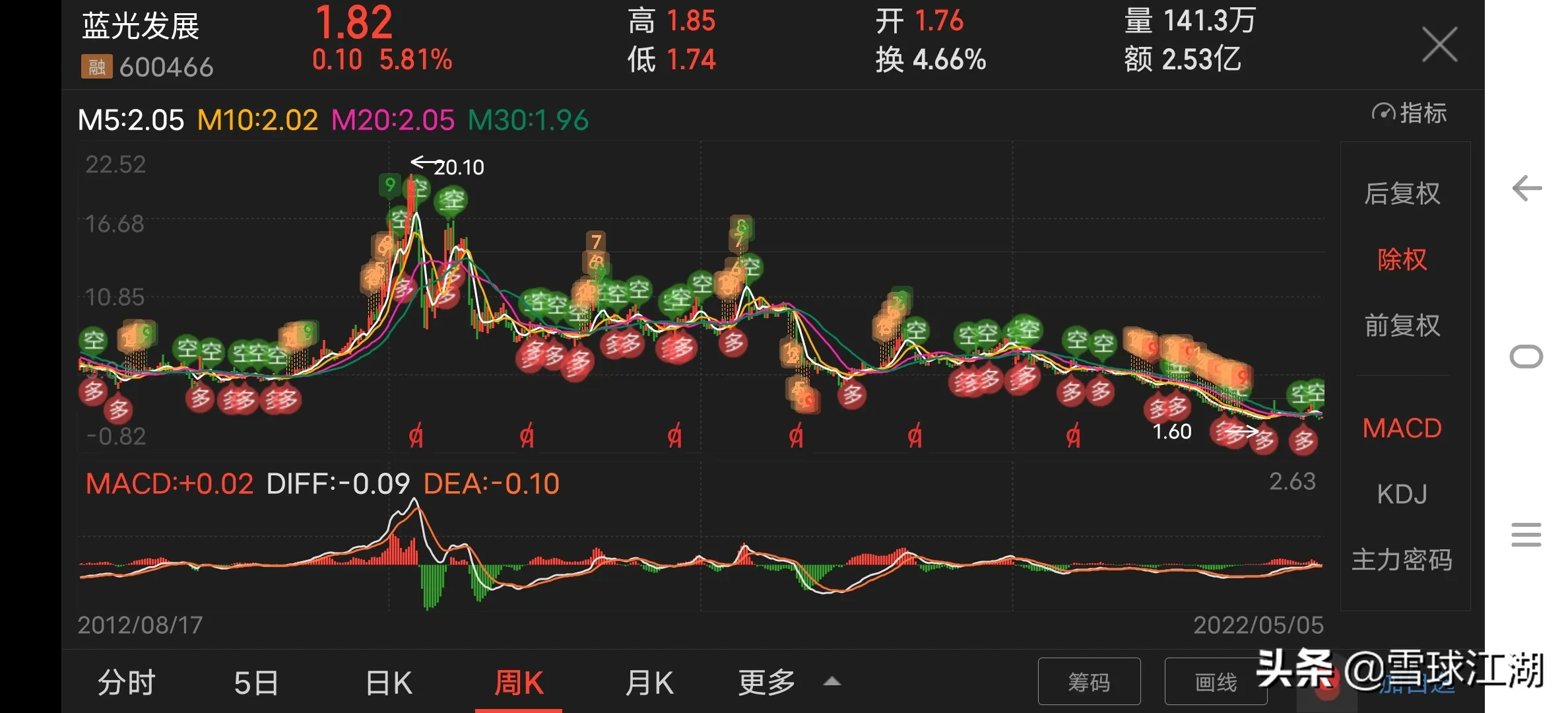 这支股票无论大盘怎样的波动,他的大方向就是趋势性的下跌。特别是从2018年开始,它的股票价格在趋势下跌的基础上来了一个加速性下跌。