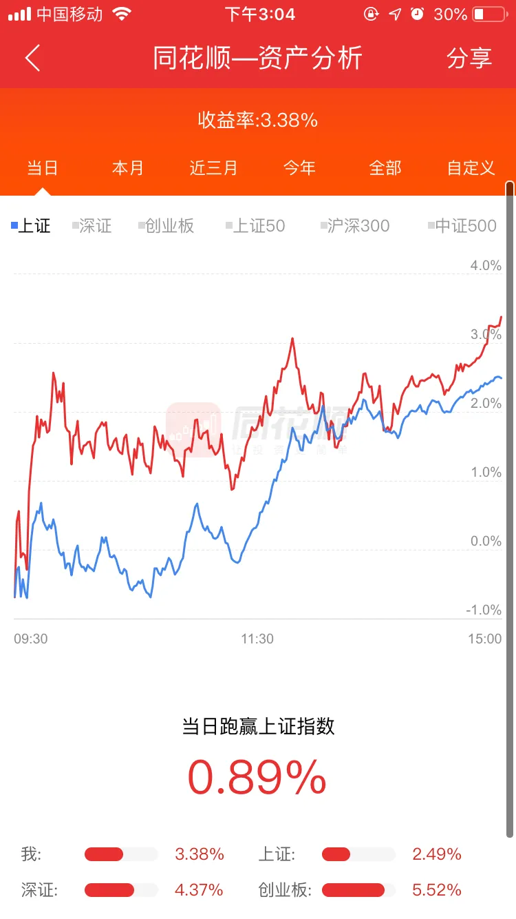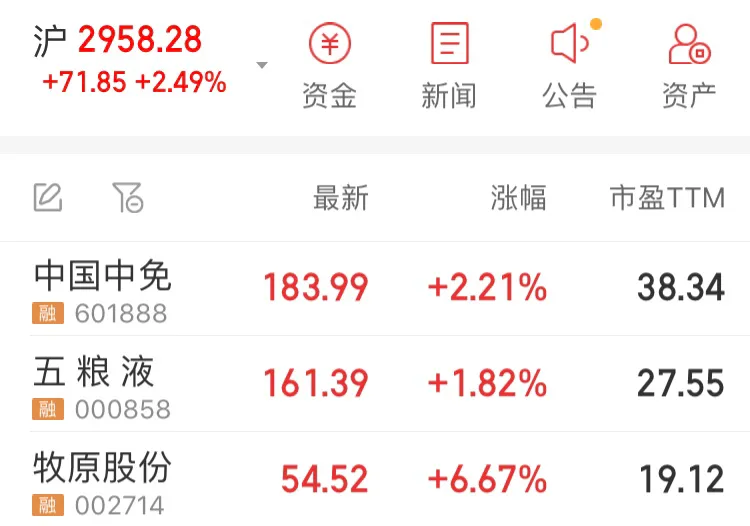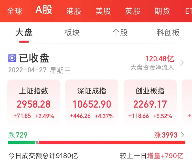1.我们A股今天终于争气了一把,大盘收涨2.49%,创业板更是大涨5.52%,创下近3年单日最大涨幅,个人持仓市值今天也大涨达到3.38%,普天同庆昨晚美股大跌,按照A股的德行还以为今天悬了,没找到直接来个低开高走,漂亮小玄子持仓的三只股票也全部翻红,不过在这巨大的涨幅下,中免跟五粮液那么点上涨难免拉胯,不过涨了就是好样的,自行车就不要了好在牧原今天大涨将近7%,这也是推高今天收益的主要原因,看来昨夜温氏股份的一季报亏损37亿并没有多大影响,毕竟巨额亏损下温氏也大涨将近6%,可见悲观预期已经打满,接下来出现的都是利好了,等了一年多,猪企也该起飞了,非常期待牧原的财报,还有一天今天的大涨不知道有没有给与大家信心,毕竟持续下跌已经将大家心理防线击垮,不过昨天割肉的人现在肯定骂骂咧咧,心如刀绞,因为不想经历下跌,上涨也将与你无关昨天也有人给我评论留言,我说顺势而为是个伪命题,他说这叫预判,也不知道有没有预判准今天的大涨大跌代表昨天,大涨代表今天,但明天怎样,我们依然无法预测,不要企图去预测股市涨跌,要不然会非常累,牢牢把握优秀公司股权,涨跌随缘牛市多暴跌,熊市也多暴涨,这才一天,虽然给了信心,但依然不是过分乐观的时候,大涨是不可能持续的,如果明天继续下跌我们也要保持良好心态也祝我们每个人周五都能收到过节红包