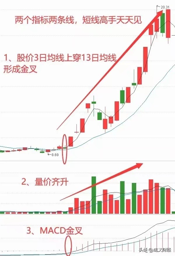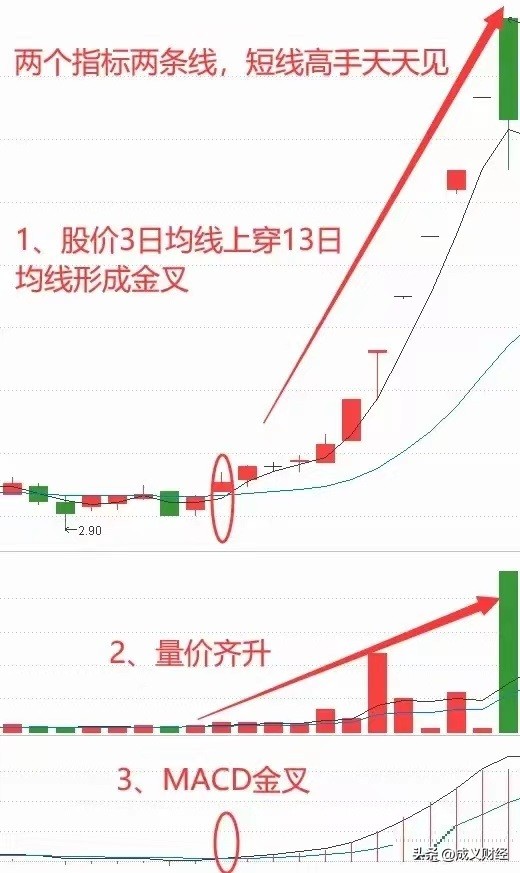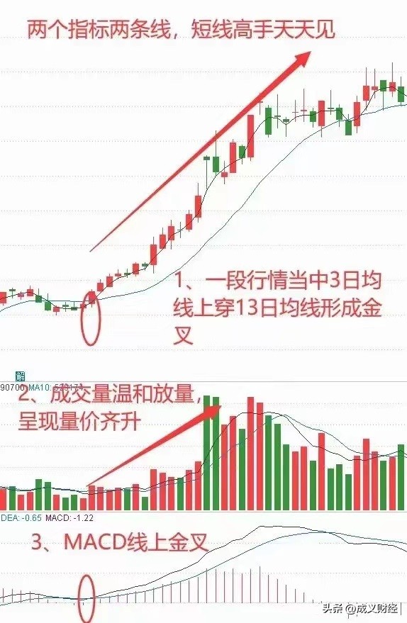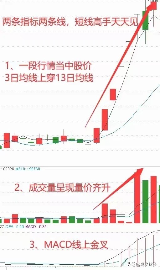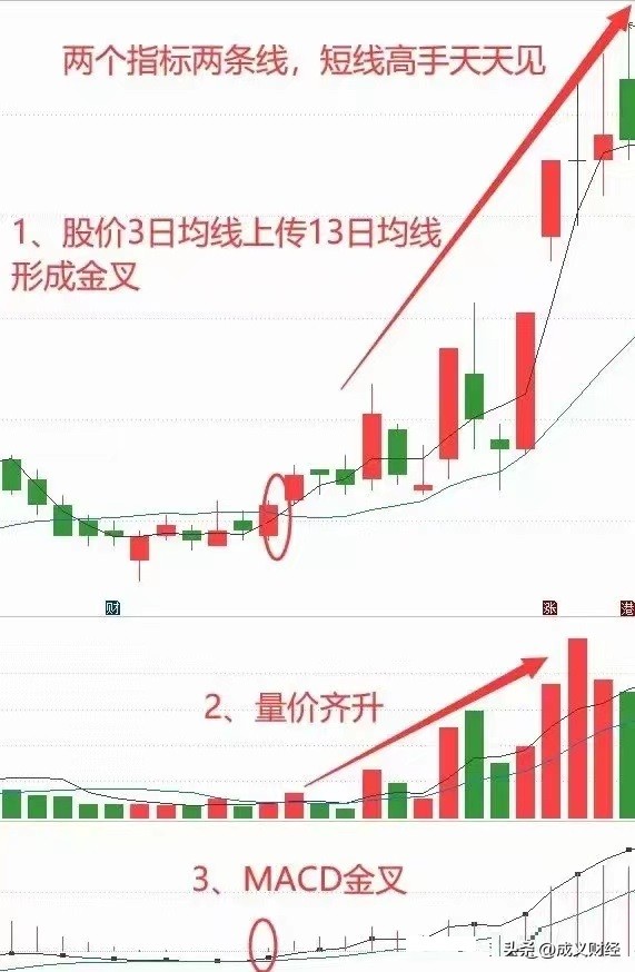 2.1、首先在均线上设置好3日线和13日均线,要等双线金叉;2、量能成温和放量,股价出现量价齐升的走势;3、幅图中MACD形成低位金叉,红色柱状在零轴上方;为了朋友们可以快速熟练的掌握这套方法,成义做成了图文放在下方,2023年我们一起扬帆起航,我是成义,只分享保护散户的干货!新朋友留个关注可以每天看到更新,除了技术文还有早评视频,提前预判大盘走势和板块热点,老朋友评论+点赞支持!