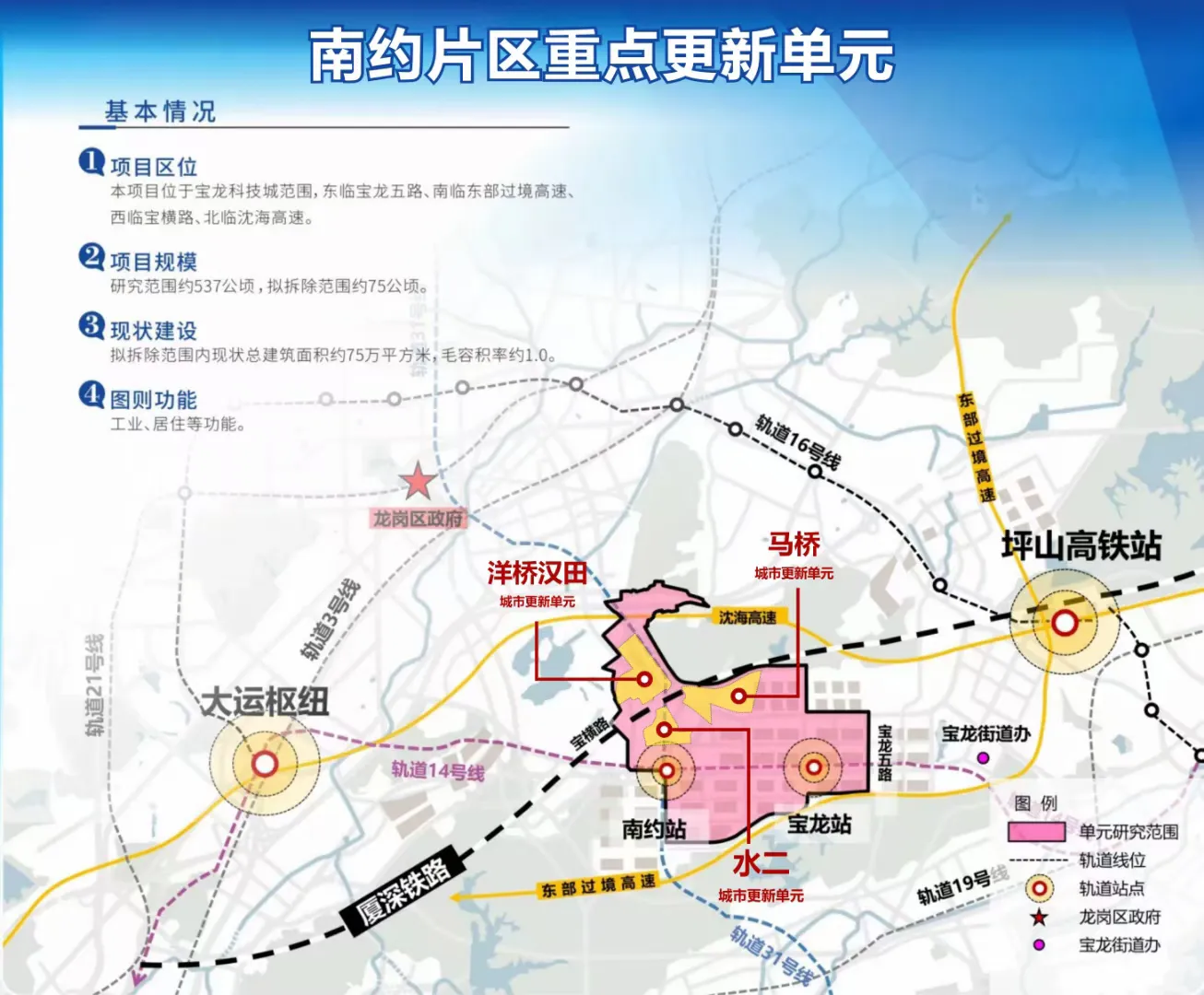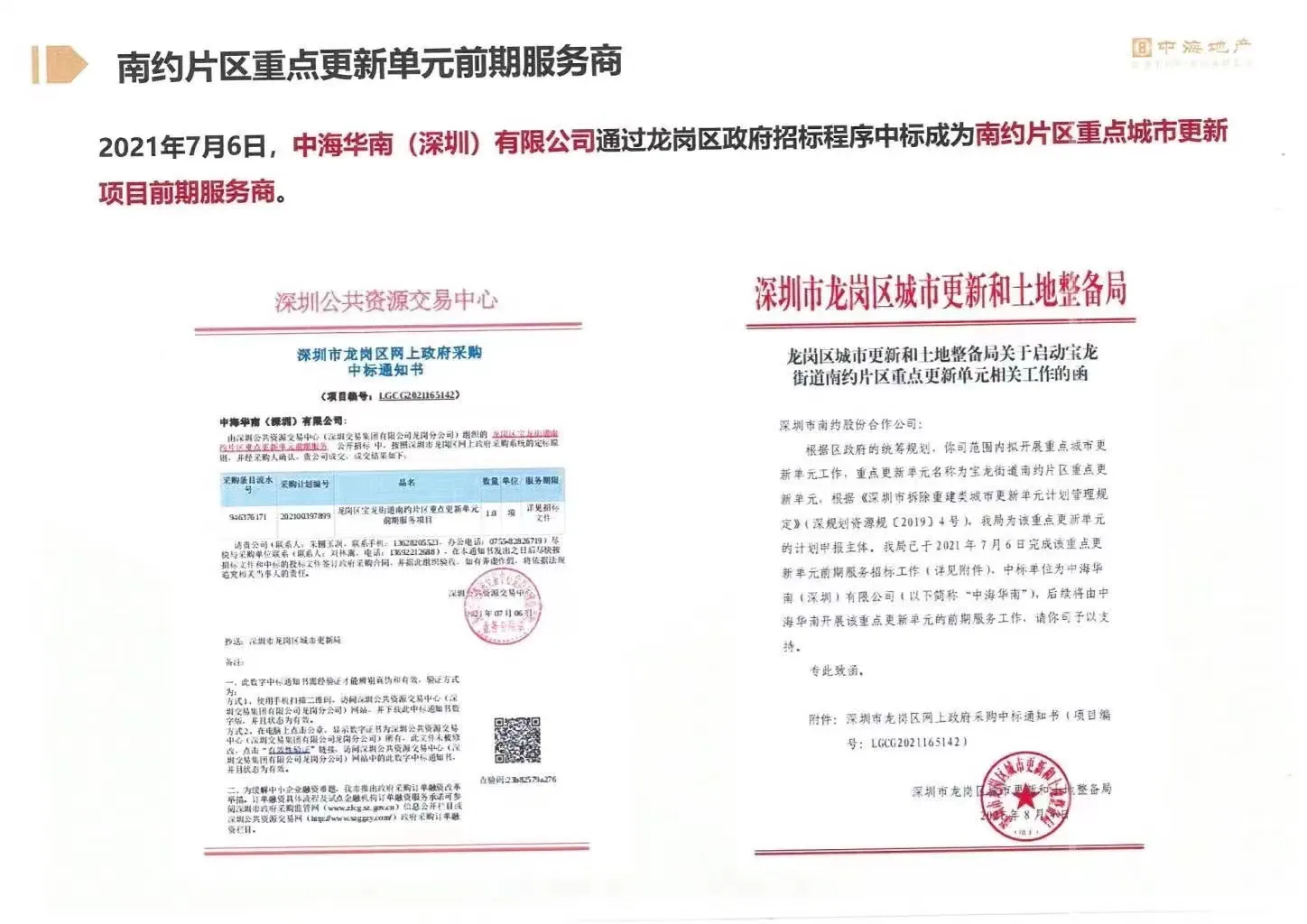 2.龙岗区洋桥和汉田旧改、马桥和联合片区旧改、水一水二旧改、炳坑旧改、积谷田旧改,中海地产南约重点城市更新单元。