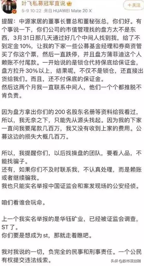 12.所以叶飞同中源家居,两方确实都是“黑”,本来双方是何某想进行股价操纵,共同牟利,结果没想到是一方割了另一方的韭菜。