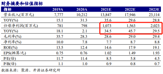 赵良毕预测2021-23年实现归母净利润为10.73/15.63/20.23亿元,同比增长34.5%/45.7%/29.5%,当前股价对应PE分别为8.5/5.8/4.5倍;