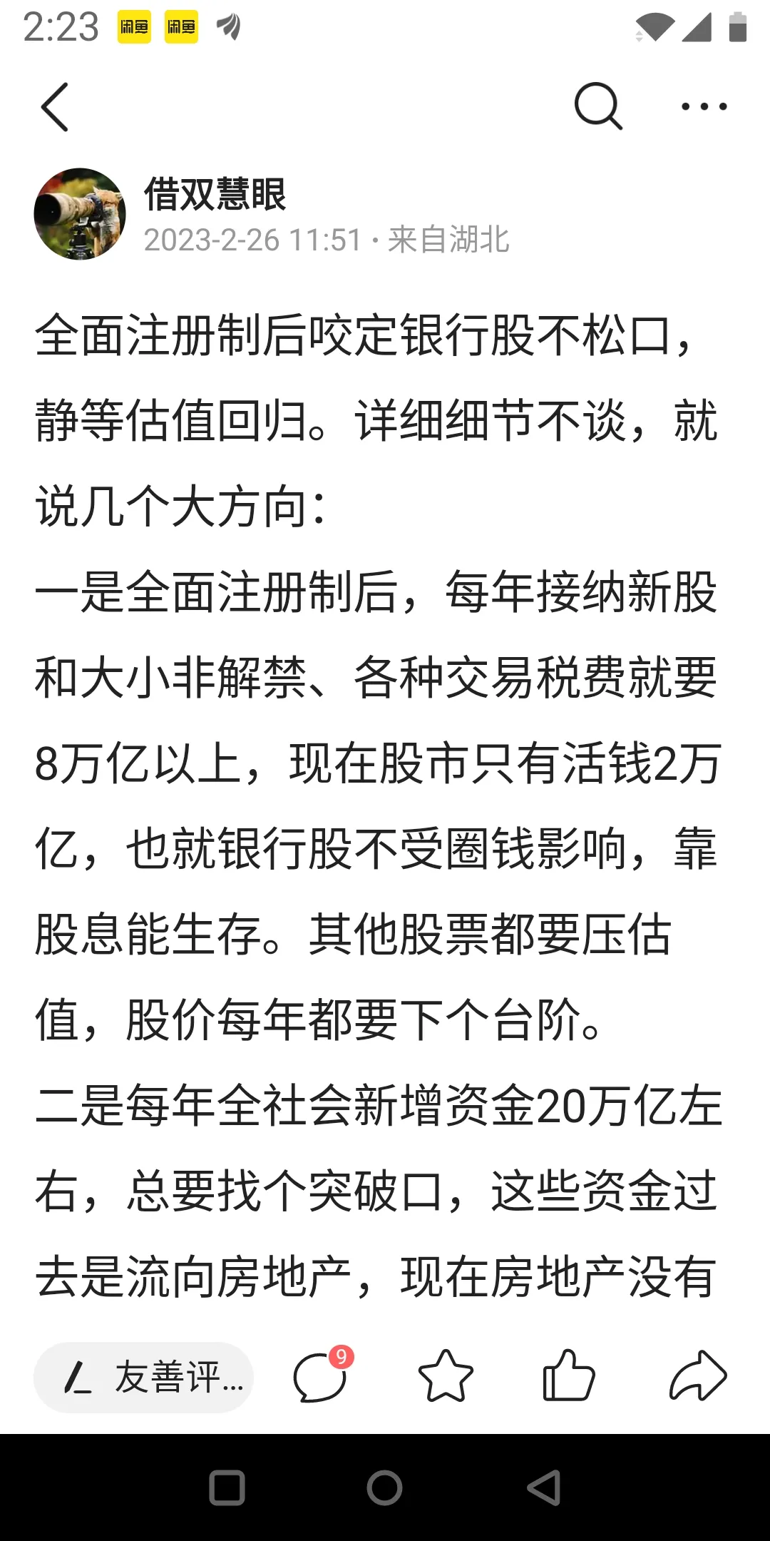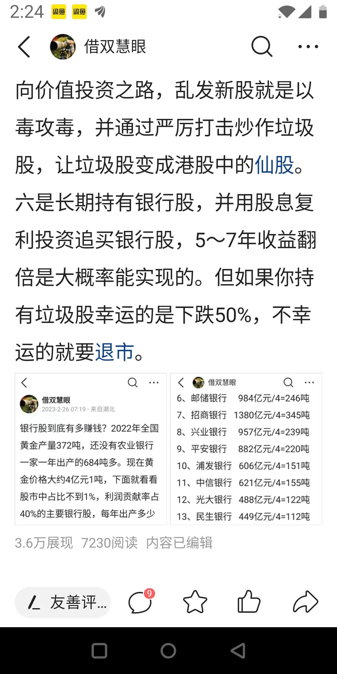 2.把银行每年赚的钱买黄金看能买多少吨(4亿元/吨):1、工商银行 3544亿元/4=886吨2、建设银行 3297亿元/4=824吨3、中国银行 2306亿元/4=576吨4、农业银行 2736亿元/4=684吨5、交通银行 905亿元/4=226吨6、邮储银行 984亿元/4=246吨7、招商银行 1380亿元/4=345吨8、兴业银行 957亿元/4=239吨9、平安银行 882亿元/4=220吨10、浦发银行 606亿元/4=151吨11、中信银行 621亿元/4=155吨12、光大银行 488亿元/4=122吨13、民生银行 449亿元/4=112吨14、北京银行 257亿元/4=64吨15、上海银行 171亿元/4=42吨A贵州茅台 592亿元/4=148吨B比亚迪 170亿元/4 = 43吨C宁德时代 315 亿元/4=79吨A股排第一的大牛股贵州茅台,赚钱能力还不如中信银行、浦发银行。