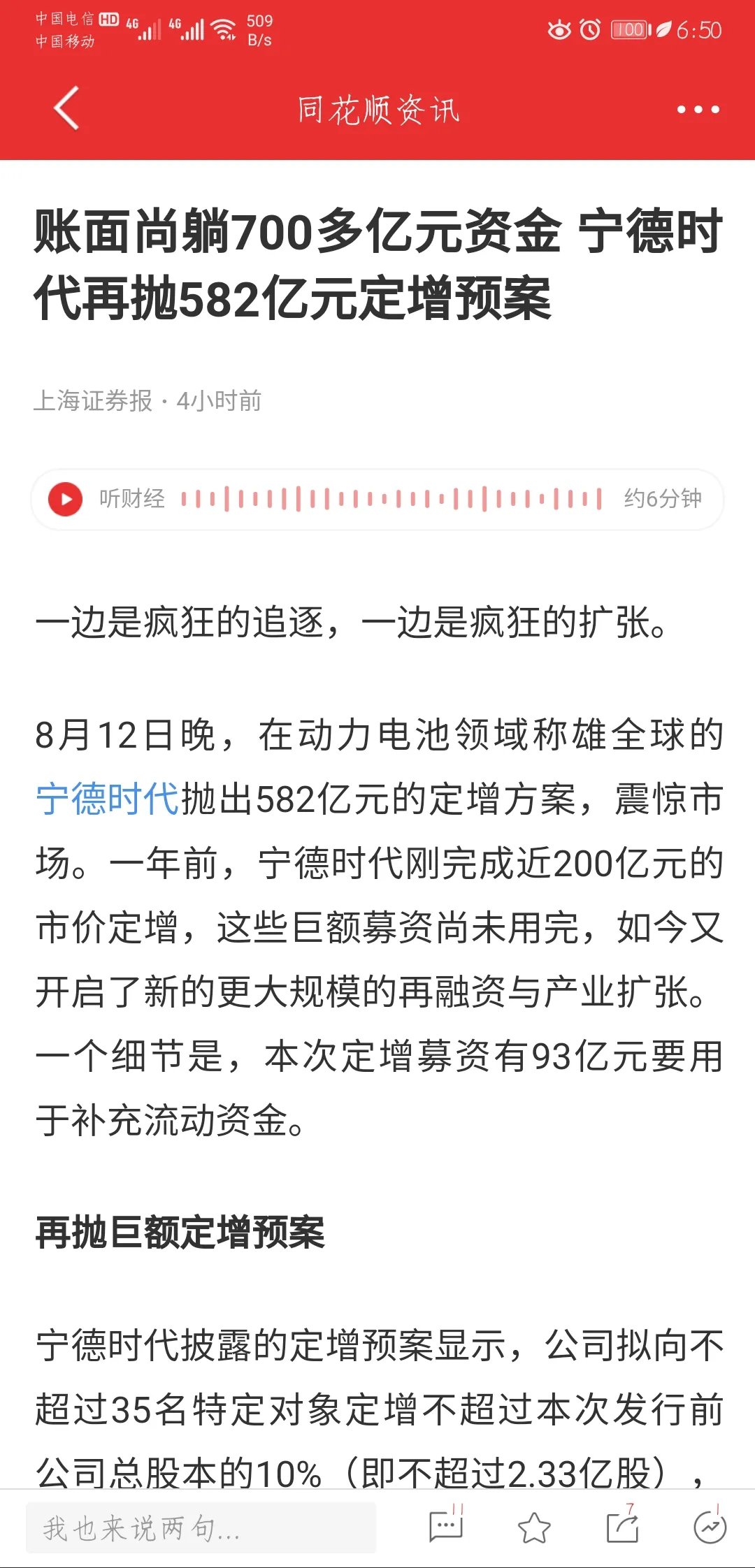 还有一个事情就是宁德时代晚上公布580亿定增方案。