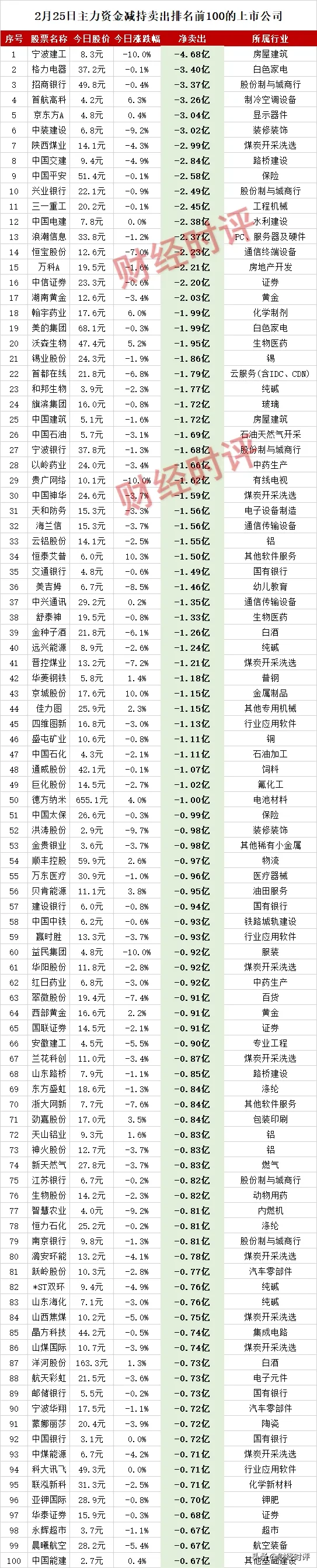 【2月25日主力资金减持卖出排名前100的上市公司】