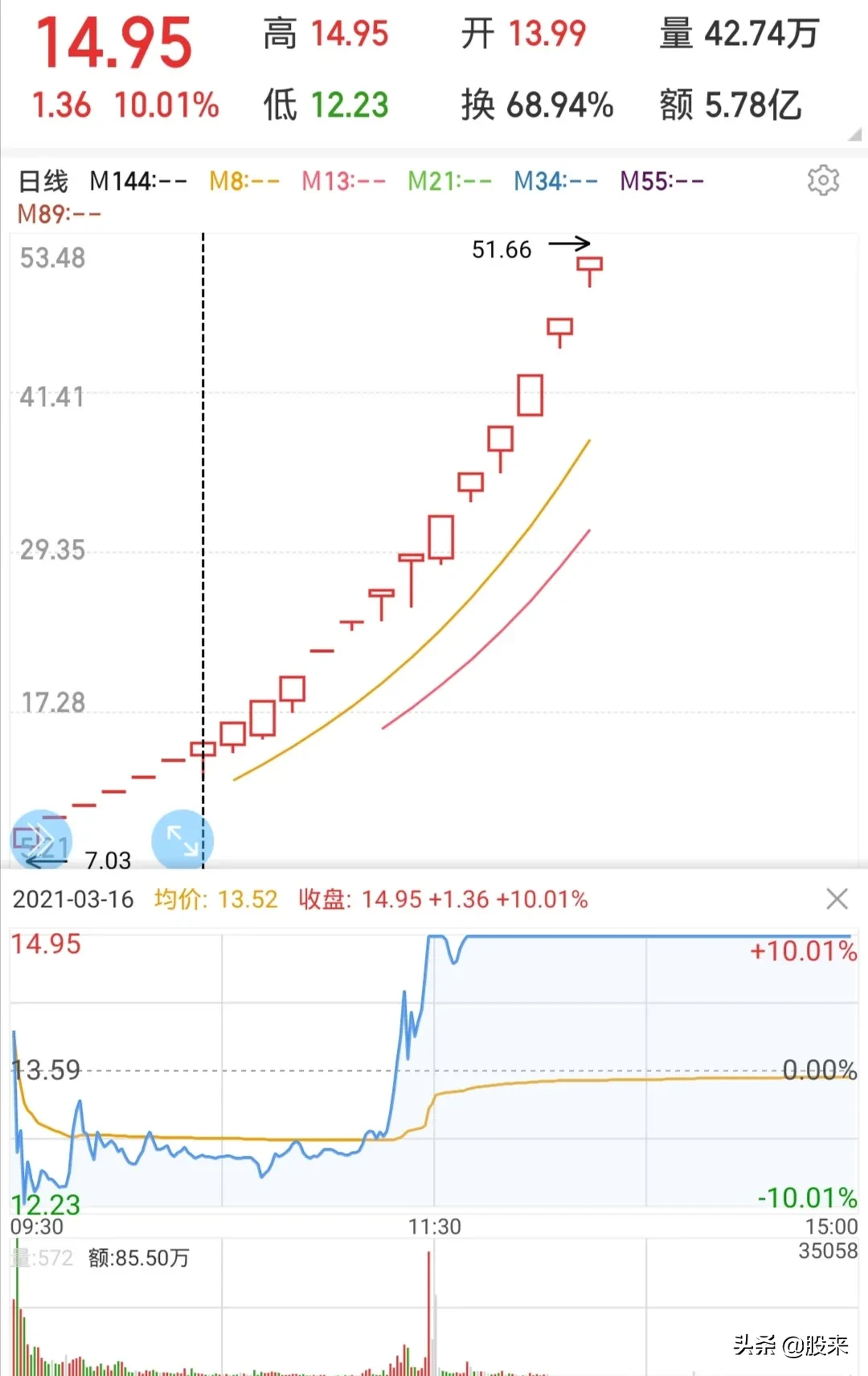 2021年3月16日,王平安躺在床上翻看着手机同花顺,打开当日换手率排行榜,一只换手率高达68.94%的新股吸引住了他。该股今日不但换手率高,而且振幅巨大,最低跌停价12.23元,最高涨停价14.95元,从跌停板到涨停板,很显然有大资金操控了。