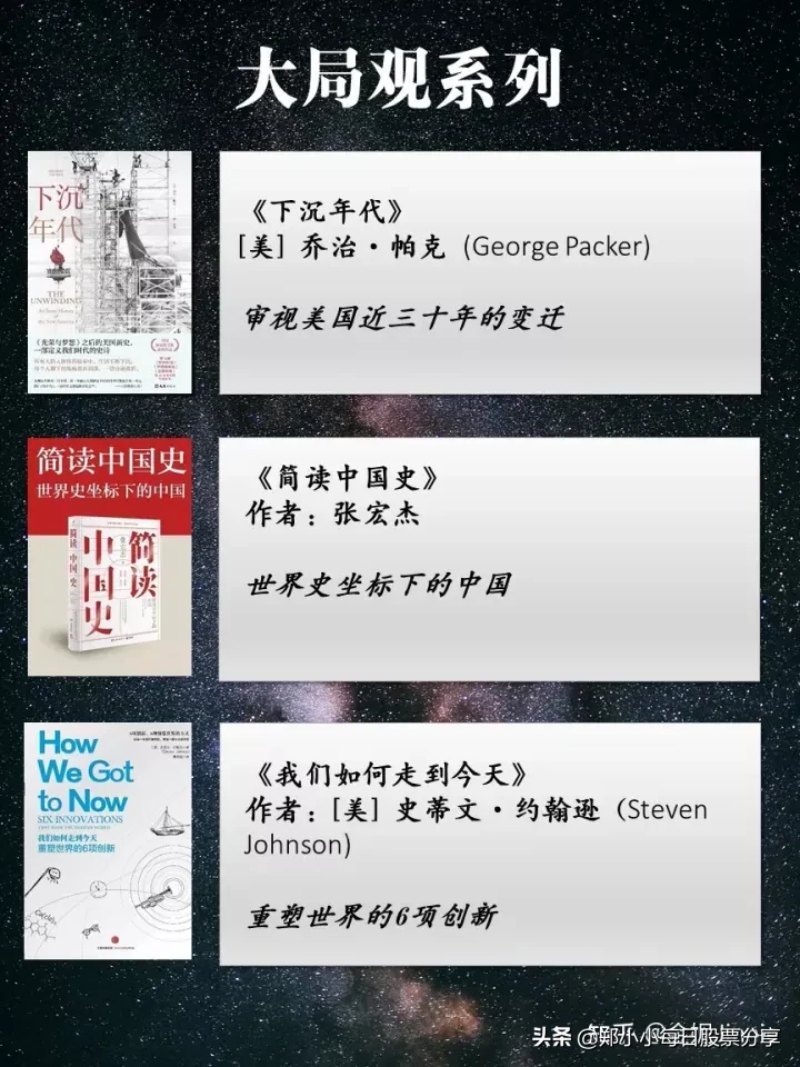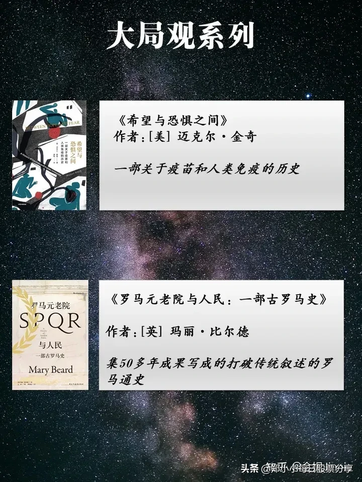 4.结合我自己的喜好隆重推荐给大家!《下沉年代》乔治·帕克审视美国近三十年的变迁《简读中国史》张宏杰世界史坐标下的中国《我们如何走到今天》史蒂文·约翰逊重塑世界的6项创新《希望与恐惧之间》迈克尔·金奇一部关于疫苗和人类免疫的历史《罗马元老院与人民:一部古罗马史》玛丽·比尔德集50多年成果写成的打破传统叙述的罗马通史《稀缺:我们是如何陷入贫穷与忙碌的》塞德希尔·穆来纳森为什么穷困之人会永远缺钱,而忙碌之人会永远缺时间?《领导人格与组织命运》罗伯特·霍根如何利用人格来理解组织、管理团队《专业服务公司的管理》大卫•梅斯特被奉为专业服务领域的管理圣经《再造卓越》柯林斯深度分析11家从辉煌走向衰落的企业《全黑军团》詹姆斯·克尔如何打造一支能持续打硬仗、打胜仗的铁军《Invent and Wander: The Collected Writings of Jeff Bezos》杰夫·贝佐斯世界首富贝佐斯如何打造商业帝国亚马逊的《元素的盛宴》山姆·基恩化学与人类生活交互作用的一部趣味史《暗淡蓝点》卡尔·萨根一部纵贯往昔、今日与未来的史诗, 对人类未来的太空家园的长远展望《海伯利安》丹·西蒙斯一部最浩瀚壮美的星际史诗,充满着真实可信、面临艰难道德抉择的故事人物《洞见》罗伯特·赖特从科学到哲学,打开人类的认知真相《习惯的力量》查尔斯·杜希格人生不过是无数习惯的总和《心》稻盛和夫日本经营之圣稻盛和夫的一生嘱托《当尼采哭泣》欧文·亚隆一篇高潮迭起的心理推理小说《偏见的本质》戈登·奥尔波特舒适圈、鄙视链、地图炮、替罪羊……打破偏见从了解偏见开始《鱼王》维克托·阿斯塔菲耶夫人类的足迹在其间虽如雪泥鸿爪,却又带着生命不息的尊严。