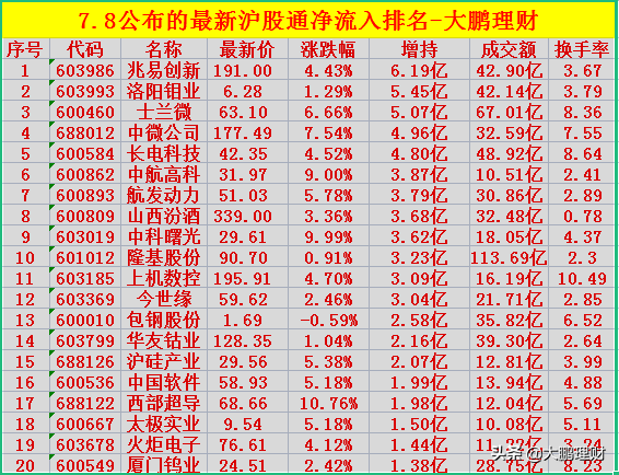 重磅消息!7月8日刚刚公布的北向资金沪股通净流入排行榜,看看有没有你的持仓股: