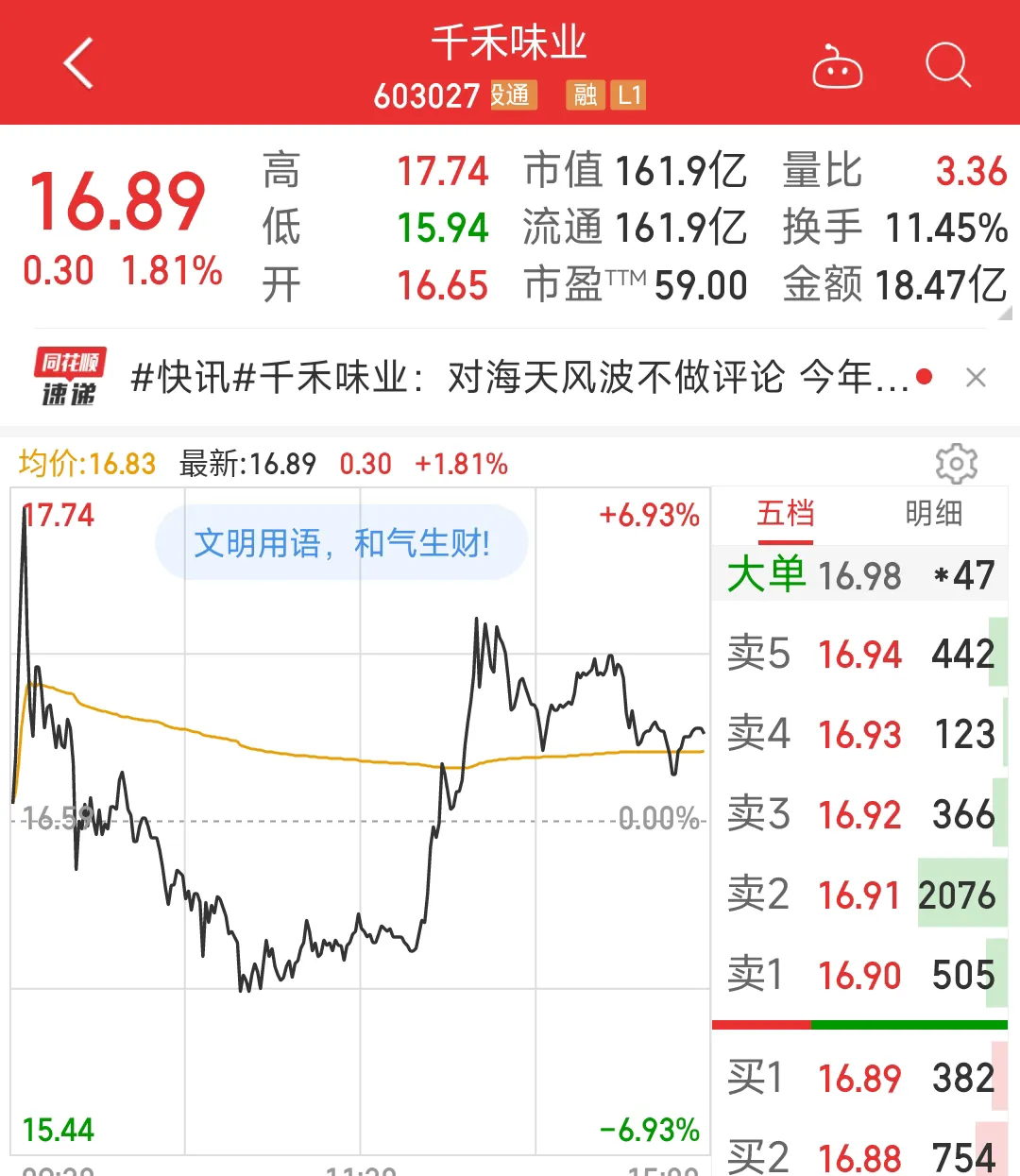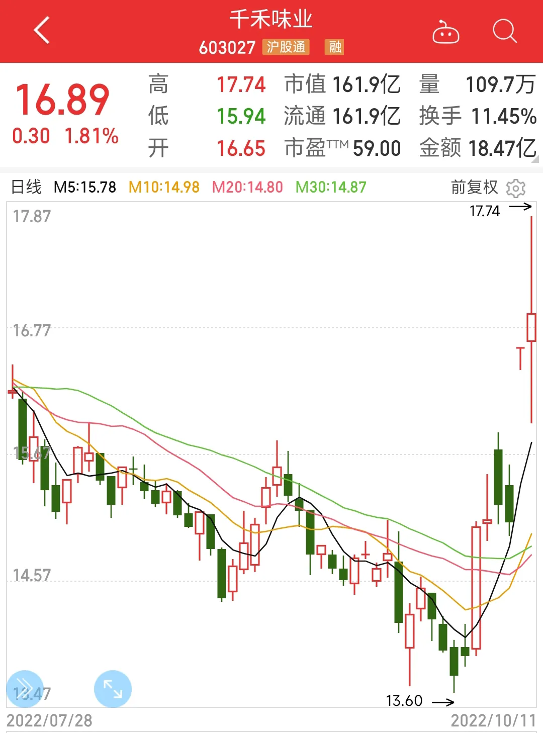 6.下午大盘翻红,千禾的股价跟着反弹了上来,最终以上涨1.81%收盘。