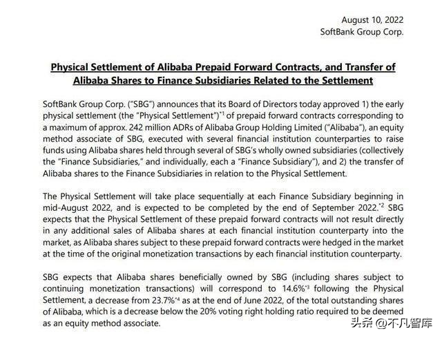 8.选择的方式就是减持阿里股份,8月10日,软银集团宣布,将通过结算预付远期合约的方式,减持阿里巴巴2.42亿股。