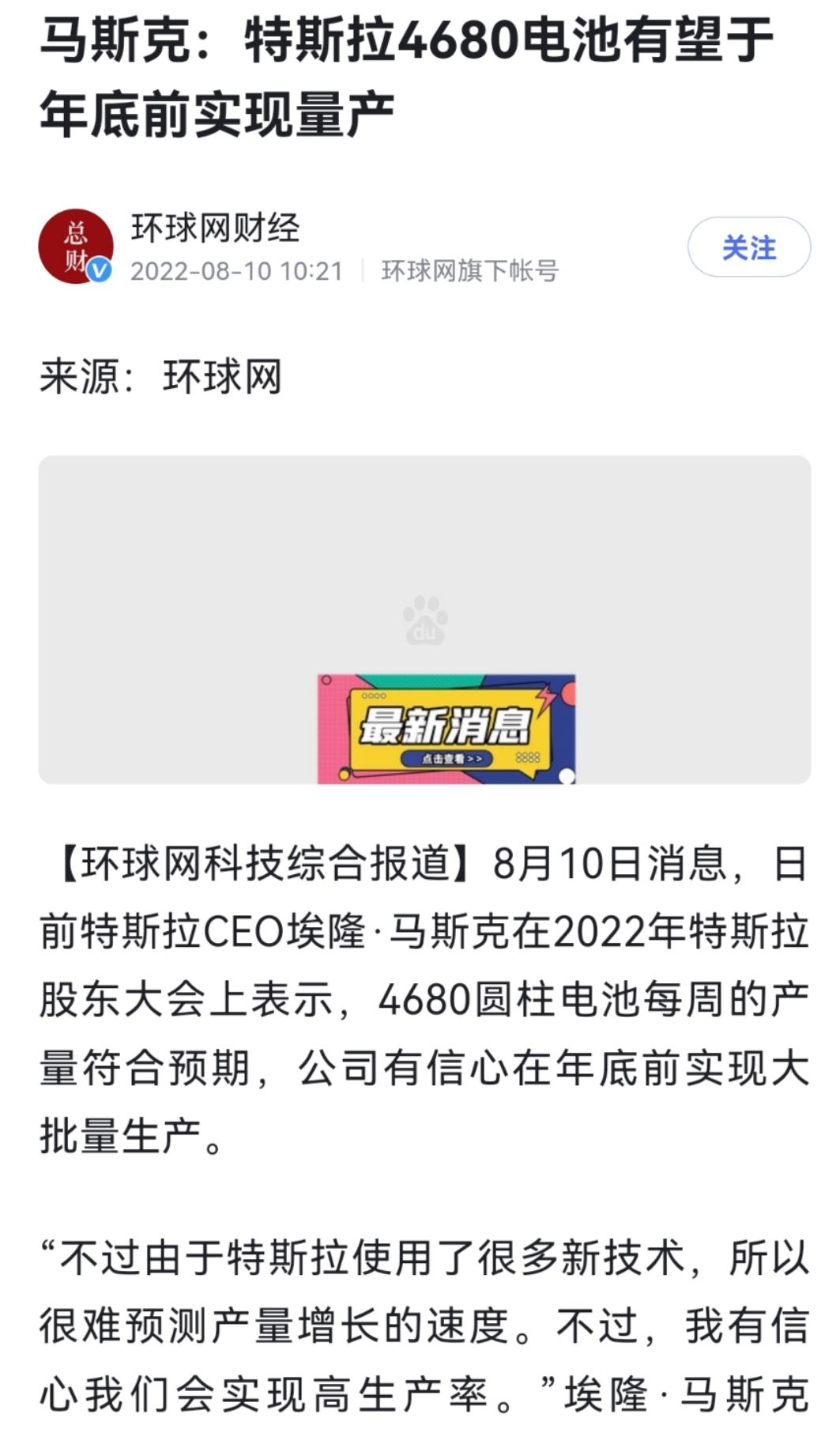 7.2022年8月的股东大会上#马斯克#就宣布可能在2022年量产,2023年1月中旬当新闻是说4680 大型圆柱电池取得了重大突破,生产成本将会恐怖的大降 54%。
