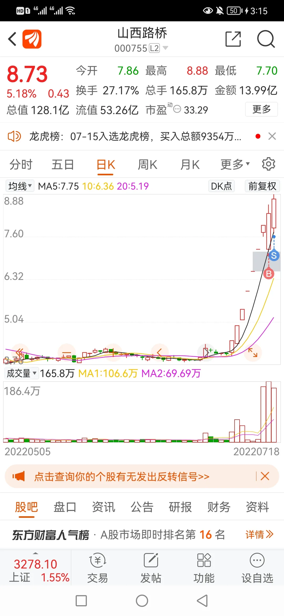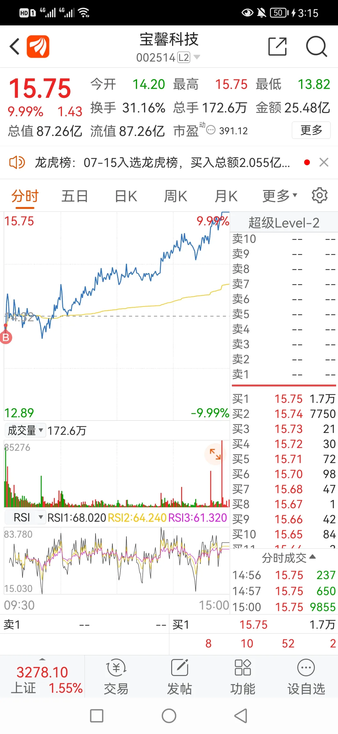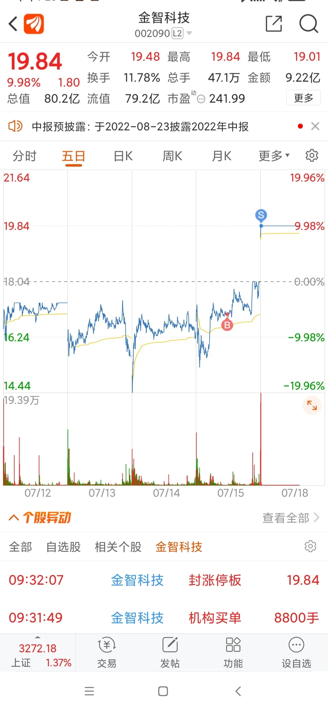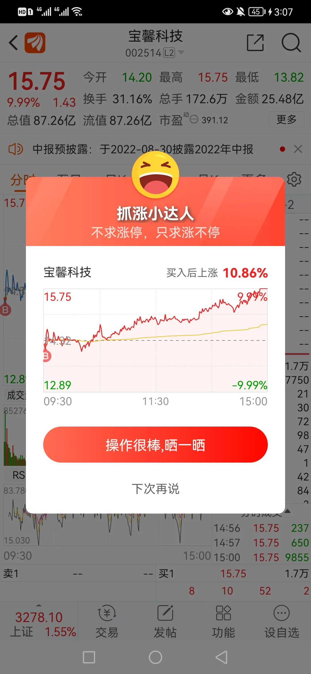 7.拿打板股来说,最近都是有分歧的时候低吸,比如上周的山西路桥、金智科技,今天的宝馨科技…都是当天获利超过10个点了,你说厉害不?完了就是会买大概2-3只票,每个2成仓。