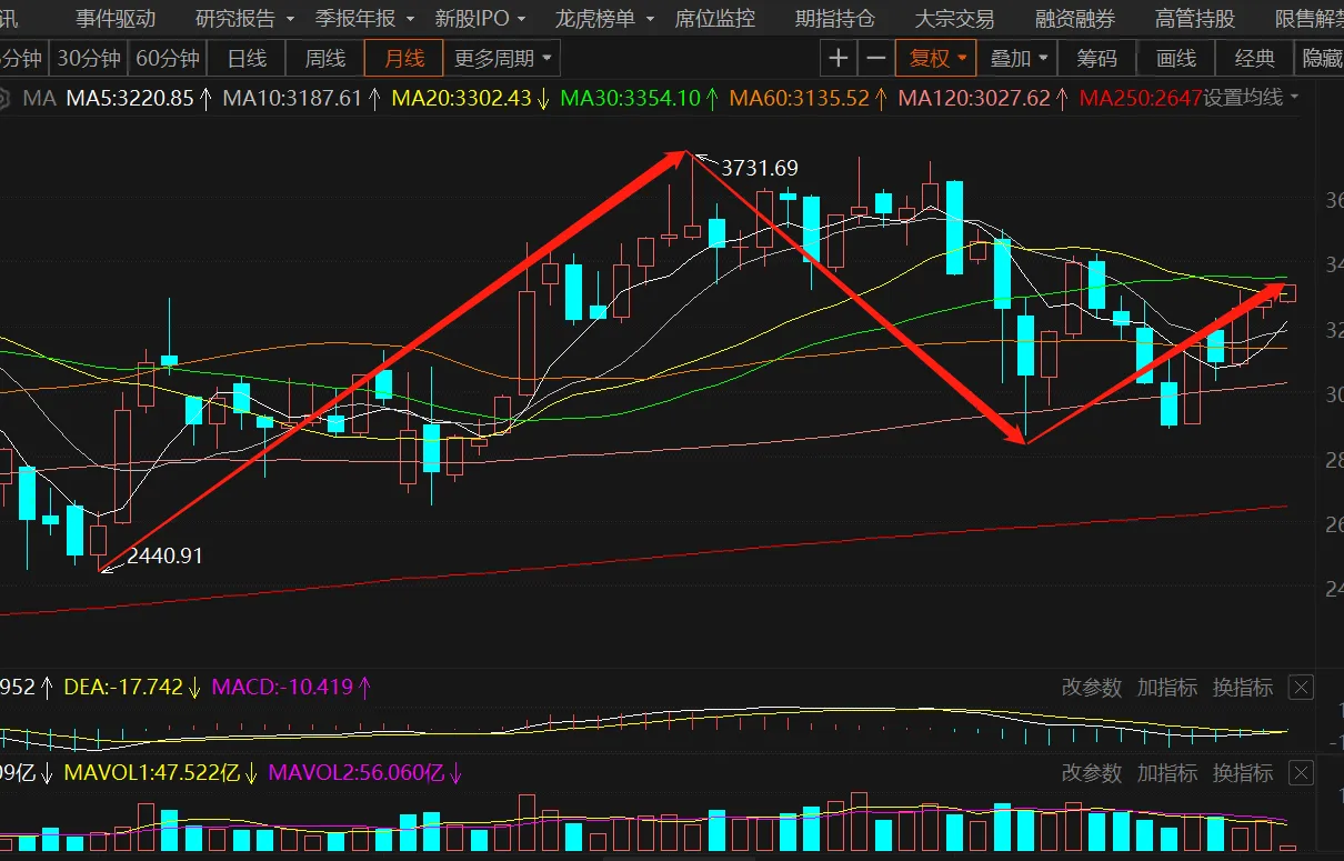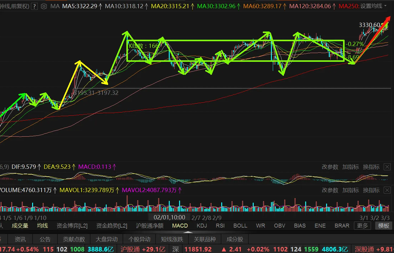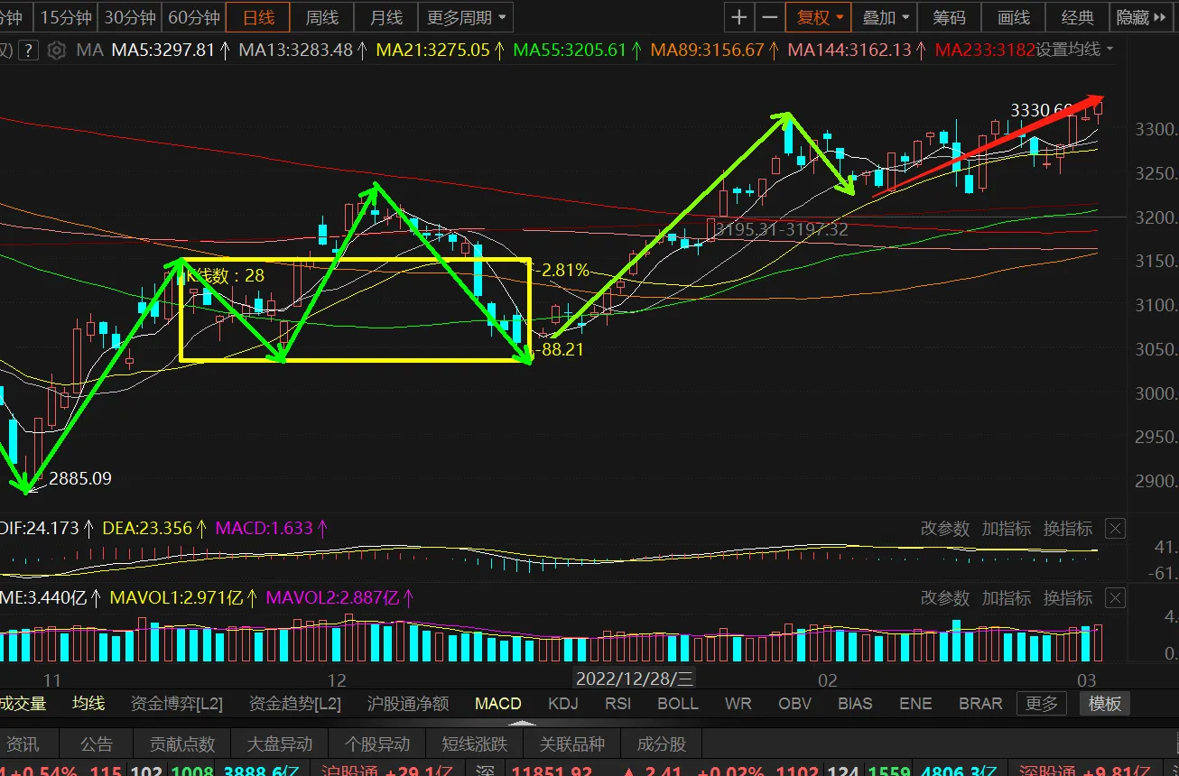 2.下面4幅图分别是月线,周线,日线,30分钟图,现在看各个级别都是往上的一笔进行中,全部往上意味着当下各个级别都是健康的,很多人刚上3310点时就跑路了,感觉不行了,现在是不是有点难受了,当时就是一个一分钟级别线段,连中枢都没有,就跑路了是不是有点早了,如果你在周五新高附近减点仓位是可以理解的,必定中枢有了,进入盘整背驰段了,线段内部有背驰了,只有这样才是合格的操作。