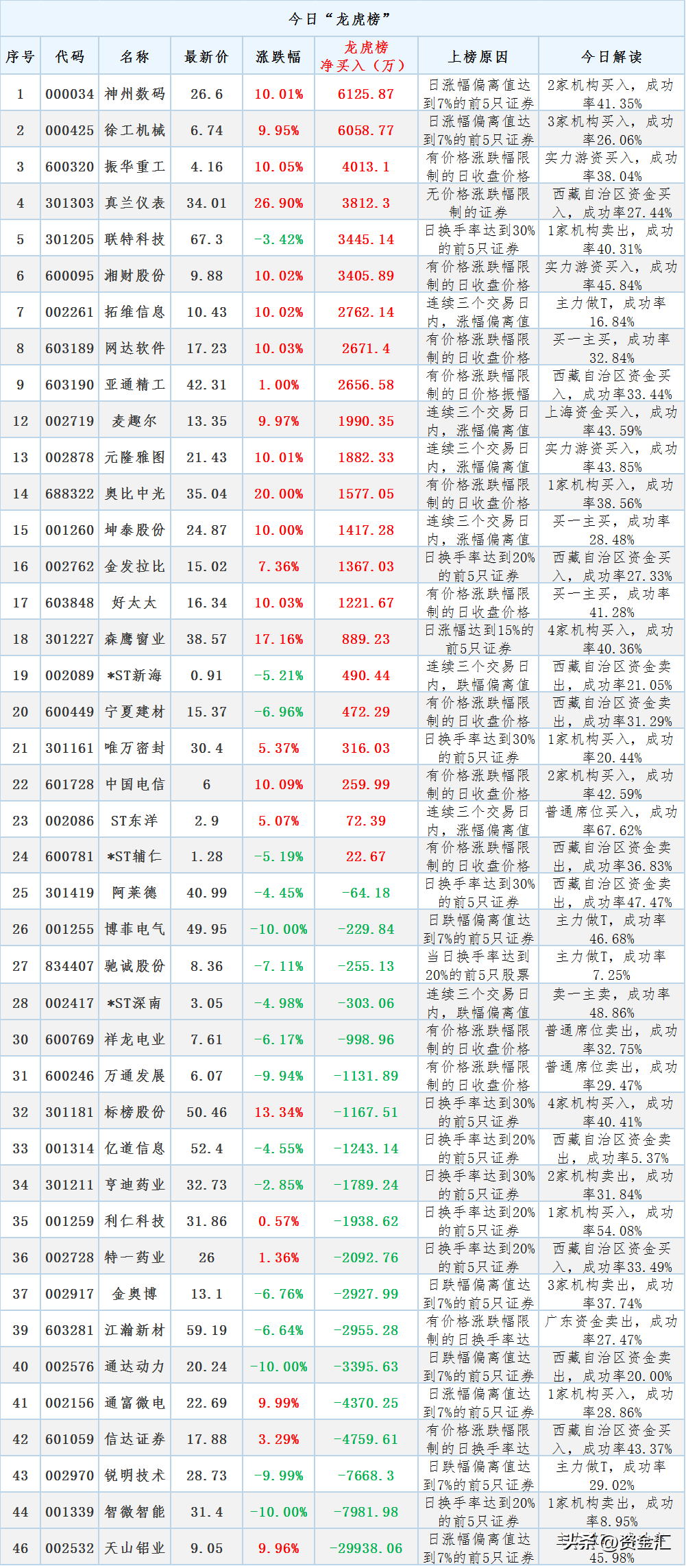 今日龙虎榜共41只个股入选,其中上涨24只,下跌17只。