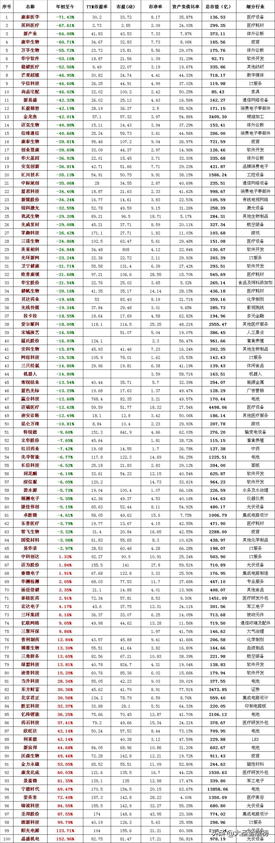 1.今年以来,创业板指成分股跌幅排名(10/18):1,康泰医学,今年跌幅达-71.43%;2,英科医疗,今年跌幅达-67.61%;3,新产业,今年跌幅达-64.08%;4,康华生物,今年跌幅达-60.71%;5,万孚生物 ,今年跌幅达-55.72%;6,华宇软件,今年跌幅达-53.16%;7,稳健医疗,今年跌幅达-52.56%;8,芒果超媒,今年跌幅达-46.95%;9,宇信科技,今年跌幅达-46.60%;10,尚品宅配,今年跌幅达-46.02%;11,新易盛,今年跌幅达-42.32%;12,长盈精密,今年跌幅达-42.19%;13,金龙鱼,今年跌幅达-42.01%;14,迈克生物,今年跌幅达-40.88%;15,信维通信,今年跌幅达-40.66%;16,康泰生物,今年跌幅达-39.81%;17,创业慧康,今年跌幅达-39.69%;18,华大基因,今年跌幅达-36.92%;19,安克创新,今年跌幅达-36.81%;20,汇川技术,今年跌幅达-35.13%;21,中际旭创,今年跌幅达-35.06%;22,蓝思科技,今年跌幅达-34.40%;23,新媒股份,今年跌幅达-34.24%;24,锐科激光,今年跌幅达-32.55%;25,我武生物,今年跌幅达-29.20%;26,光威复材,今年跌幅达-29.08%;27,掌趣科技,今年跌幅达-26.42%;28,三诺生物,今年跌幅达-24.86%;29,美亚柏科,今年跌幅达-24.84%;30,光环新网,今年跌幅达-23.24%;更多数据见下图,仅供参考,不构成投资建议!