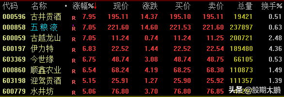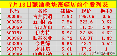 7.4、7月13日酿酒板块涨幅居前个股列表:代码 名称 涨幅% 现价 换手%000596 古井贡酒 7.92 195.06 0.5000858 五 粮 液 7.54 222.6 0.62600059 古越龙山 7.14 11.25 2.46600197 伊力特 6.97 22.55 4.32000860 顺鑫农业 6.74 68.37 1.48603369 今世缘 6.66 48.7 0.52600779 水井坊 5.61 77.2 1600809 山西汾酒 5.03 162.17 0.43每天@股期大鹏 都会和大家分享最新的股市期货大事、投资分析,欢迎点赞、转发、评论,更多请加关注 @股期大鹏