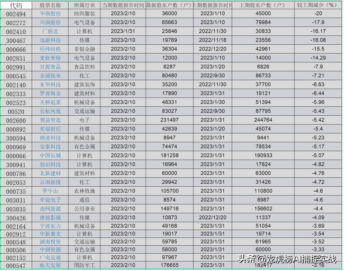 1.2月15日,近期股东人数减少排行:代码 股票名称 较上期减少(%) 所属行业002494 华斯股份 -20 纺织服装002272 川润股份 -17.9 电气设备002410 广联达 -16.17 计算机300467 迅游科技 -16.08 传媒000666 经纬纺机 -15.5 非银金融002851 麦格米特 -14.29 电气设备002991 甘源食品 -7.9 食品饮料000545 金浦钛业 -7.21 化工002140 东华科技 -6.63 建筑装饰002333 罗普斯金 -6.44 建筑材料002523 天桥起重 -5.96 机械设备00520 长航凤凰 -5.43 交通运输002600 领益智造 -5.42 电子000892 欢瑞世纪 -5.4 传媒300594 朗进科技 -5.23 机械设备000969 安泰科技 -5.17 有色金属000066 中国长城 -5.07 计算机300941 创识科技 -4.82 计算机000786 北新建材 -4.76 建筑材料002053 云南能投 -4.72 化工000735 罗牛山 -4.6 农林牧渔003031 中瓷电子 -4.6 通信003035 南网能源 -4.4 公用事业300426 唐德影视 -4.09 传媒002164 宁波东力 -3.69 机械设备002912 中新赛克 -3.54 计算机000548 湖南投资 -3.52 交通运输000506 中润资源 -3.33 有色金属002152 广电运通 -3.21 计算机000547 航天发展 -3.16 国防军工排名前三的分别是:1、002494 华斯股份主题概念:中俄贸易、网红经济、雄安新区、地摊经济、纺织服装2、002272 川润股份 主题概念:风电、通用设备、高端装备、军工、碳中和3、002410 广联达 主题概念:融资融券、软件、沪深300、数字经济、数字孪生