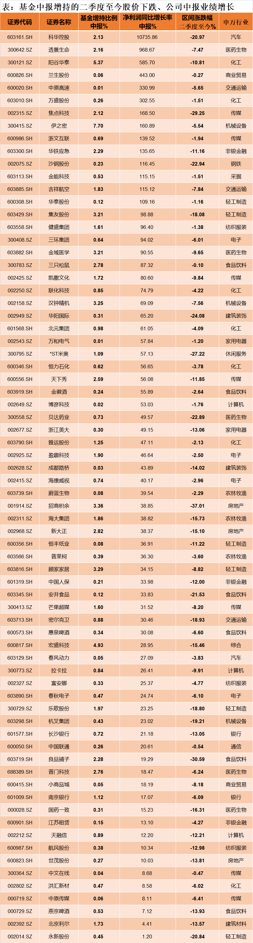 1.表:基金中报增持的二季度至今股价下跌、公司中报业绩增长 证券代码 证券名称 基金增持比例 中报% 净利润同比增长率 中报% 区间涨跌幅 二季度至今% 申万行业 603161.SH 科华控股 2.13 10735.86 -20.97 汽车 300642.SZ 透景生命 2.16 968.67 -7.47 医药生物 300121.SZ 阳谷华泰 5.37 585.70 -10.81 化工 600826.SH 兰生股份 0.06 443.00 -0.27 商业贸易 600020.SH 中原高速 0.01 330.99 -5.65 交通运输 603010.SH 万盛股份 0.26 302.55 -1.51 化工 002315.SZ 焦点科技 2.12 168.50 -29.25 传媒 300415.SZ 伊之密 7.70 160.89 -5.54 机械设备 600986.SH 浙文互联 0.69 139.52 -1.94 传媒 603300.SH 华铁应急 2.29 135.65 -11.16 非银金融 002075.SZ 沙钢股份 0.23 116.45 -22.94 钢铁 603113.SH 金能科技 0.53 115.15 -1.51 采掘 603885.SH 吉祥航空 1.83 115.12 -7.84 交通运输