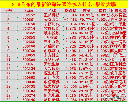 1.重磅消息!8月6日刚刚公布的沪深港通净流入排行榜,看看有没有你的持仓股:截至8月5日,北向资金净增持20大个股列表:序号 代码 名称 涨跌幅 市值 增持 所属板块1 002157 正邦科技 10.01% 18.93亿 4.09亿 农牧饲渔2 000661 长春高新 -0.21% 50.77亿 3.08亿 医药制造3 300750 宁德时代 -0.16% 195.02亿 2.66亿 汽车行业4 002714 牧原股份 1.73% 107.61亿 2.60亿 农牧饲渔5 002352 顺丰控股 -0.21% 86.50亿 2.47亿 交运物流6 000858 五粮液 0.78% 579.14亿 2.31亿 酿酒行业7 002555 三七互娱 3.26% 61.09亿 2.20亿 电子信息8 300760 迈瑞医疗 0.82% 220.06亿 2.10亿 医疗行业9 600760 中航沈飞 1.49% 11.14亿 1.99亿 航天航空10 300059 东方财富 1.69% 64.41亿 1.99亿 电子信息11 600309 万华化学 2.41% 71.81亿 1.84亿 化工行业12 600161 天坛生物 3.07% 13.89亿 1.69亿 医药制造13 002124 天邦股份 4.05% 6.07亿 1.62亿 农牧饲渔14 600570 恒生电子 2.43% 75.35亿 1.35亿 软件服务15 000568 泸州老窖 1.50% 37.01亿 1.30亿 酿酒行业16 600030 中信证券 -1.03% 92.65亿 1.30亿 券商信托17 000738 航发控制 10.00% 4.56亿 1.25亿 航天航空18 600703 三安光电 6.66% 29.90亿 1.22亿 电子元件19 300274 阳光电源 1.41% 10.23亿 1.18亿 输配电气20 300146 汤臣倍健 -0.08% 19.57亿 1.18亿 食品饮料注意,沪深港通流向有参考意义,应该更多关注公司的基本面及行业的景气度,切莫成了机构的接盘侠!每天@股期大鹏 都会和大家分享最新的股市期货大事、投资分析,欢迎点赞、转发、评论,更多请加关注 @股期大鹏
