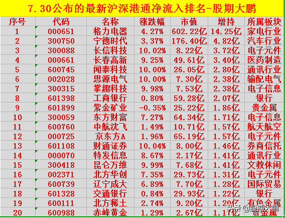 1.重磅消息!7月30日刚刚公布的沪深港通净流入排行榜,看看有没有你的持仓股:截至7月29日,北向资金净增持20大个股列表:序号 代码 名称 涨跌幅 市值 增持 所属板块1 000651 格力电器 4.27% 602.22亿 14.25亿 家电行业2 300750 宁德时代 3.37% 176.40亿 4.82亿 汽车行业3 300088 长信科技 10.02% 8.22亿 3.72亿 电子元件4 000661 长春高新 9.25% 49.61亿 3.40亿 医药制造5 600745 闻泰科技 10.00% 26.05亿 2.80亿 通讯行业6 002028 思源电气 10.00% 7.30亿 2.38亿 输配电气7 300315 掌趣科技 9.98% 7.53亿 2.38亿 电子信息8 601398 工商银行 0.80% 59.28亿 2.07亿 银行9 601899 紫金矿业 -0.35% 25.22亿 1.86亿 贵金属10 300059 东方财富 7.27% 64.34亿 1.71亿 电子信息11 600760 中航沈飞 1.49% 10.71亿 1.57亿 航天航空12 000725 京东方A 1.96% 65.19亿 1.57亿 电子元件13 601108 财通证券 10.04% 8.00亿 1.46亿 券商信托14 000070 特发信息 8.67% 2.17亿 1.41亿 通讯行业15 300418 昆仑万维 9.99% 7.68亿 1.41亿 文教休闲16 002371 北方华创 7.35% 29.73亿 1.31亿 电子元件17 600739 辽宁成大 6.89% 7.70亿 1.28亿 国际贸易18 601328 交通银行 0.84% 29.93亿 1.22亿 银行19 600111 北方稀土 2.74% 9.20亿 1.20亿 有色金属20 600988 赤峰黄金 1.29% 2.67亿 1.17亿 贵金属注意,沪深港通流向有参考意义,应该更多关注公司的基本面及行业的景气度,切莫成了机构的接盘侠!每天@股期大鹏 都会和大家分享最新的股市期货大事、投资分析,欢迎点赞、转发、评论,更多请加关注 @股期大鹏
