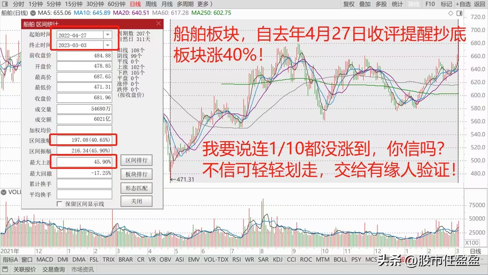 但我要告诉大家,船舶板块自471点到今天的682点,区间涨幅已经超过40%,龙头股已经翻番!去年到今年大盘怎么样,大家心里都有数。而本轮的船舶低点,我在去年10月18日发了船舶的三只研究笔记,三只都预测到了12月23日的极致抄底价位,找对地方可复盘验证。