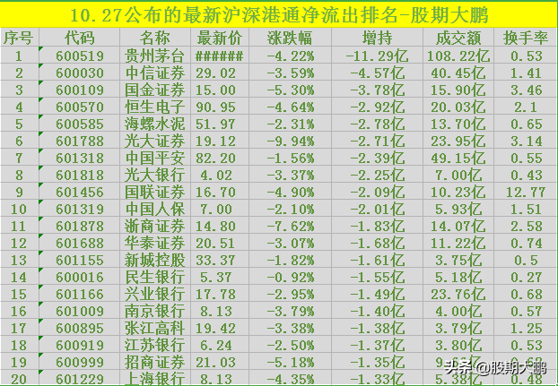 重磅消息!10月27日刚刚公布的北向资金沪股通净流出排行榜,看看有没有你的持仓股: